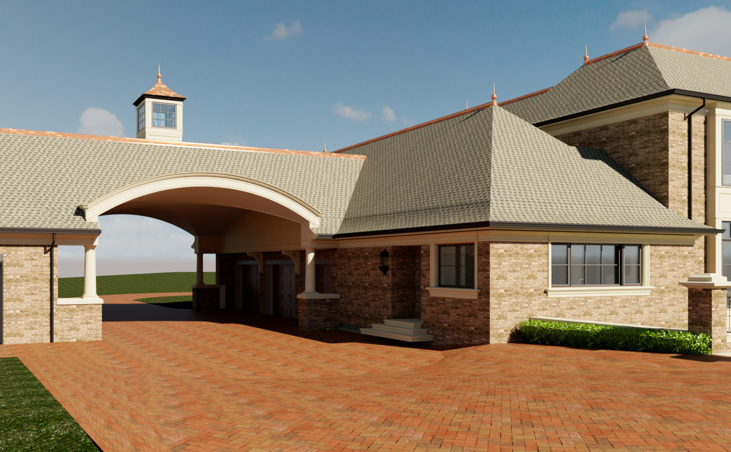 strict image to image architectural rendering do not modify geometry rooflines massing window locations or pool placement maintain exact revit model proportions and structure this is a large scale luxury estate renovation and addition the design must match the existing historic european inspired brick residence shown in reference image material palette match existing house warm multi tone brown tan traditional brick with subtle variation cream limestone trim columns entablatures and belt courses dark bronze black steel windows charcoal dimensional asphalt shingle roof wrought iron railings with classic detailing bronze gutters and downspouts architectural style transitional european estate refined but not overly ornate high end custom home in cincinnati climate zone 5a estate aesthetic brick detailing critical no geometry change enhance the brick soldier course above all windows and doors to read as realistic traditional masonry constructionmaintain exact alignment and dimensions from the modelimprove realism through correct vertical brick orientation with consistent spacing subtle mortar joint definition and depth slight color variation within the soldier course no flat color proper shadow line relief to read as a true lintel condition clean crisp alignment with adjacent brick coursingdo not thicken stretch or redesign the soldier course realism only no geometry changeslighting soft late afternoon lighting warm architectural uplighting on brick and columns realistic shadow depth photorealistic materials rendering style ultra realistic luxury architectural photography slightly overcast sky high end residential marketing quality no railing