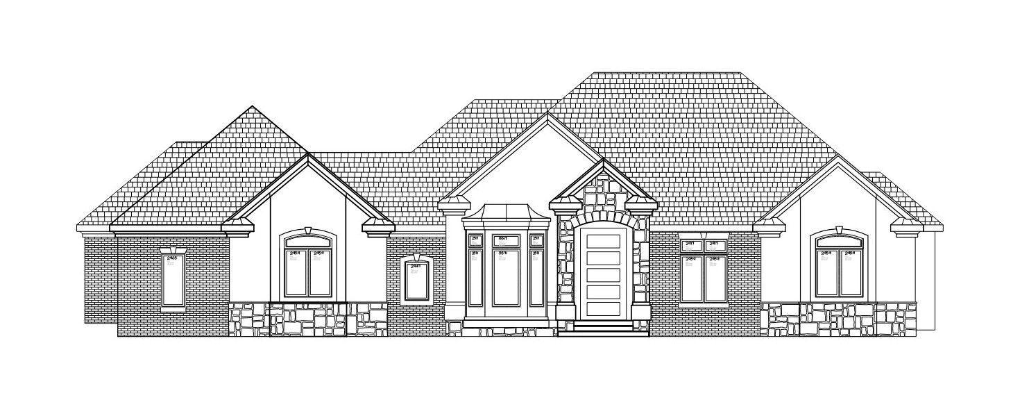 preserve the exact structure floorplan rooflines window and door placement and overall proportions of the original house do not alter massing or layout in any way transform the exterior design to match the style of the inspiration image modern farmhouse european cottage influence transitional design materials colors replace empty faces with soft beige stucco as the primary exterior finish replace stone with white mortar light limestone replace brick with painted brick shift to a clean monochromatic palette white soft beige natural tones black accents windows doors convert all windows to black aluminum or steel style frames without changing openings entry details sleek modern large single entry front door with large glass horizontal panelling add modern wall sconces in black metal add minimal clean wood accents lighting should feel warm and soft evening ambiance highlighting the modern forms overall result a clean high contrast modern farmhouse with european cottage minimalist influence while strictly preserving the original structure