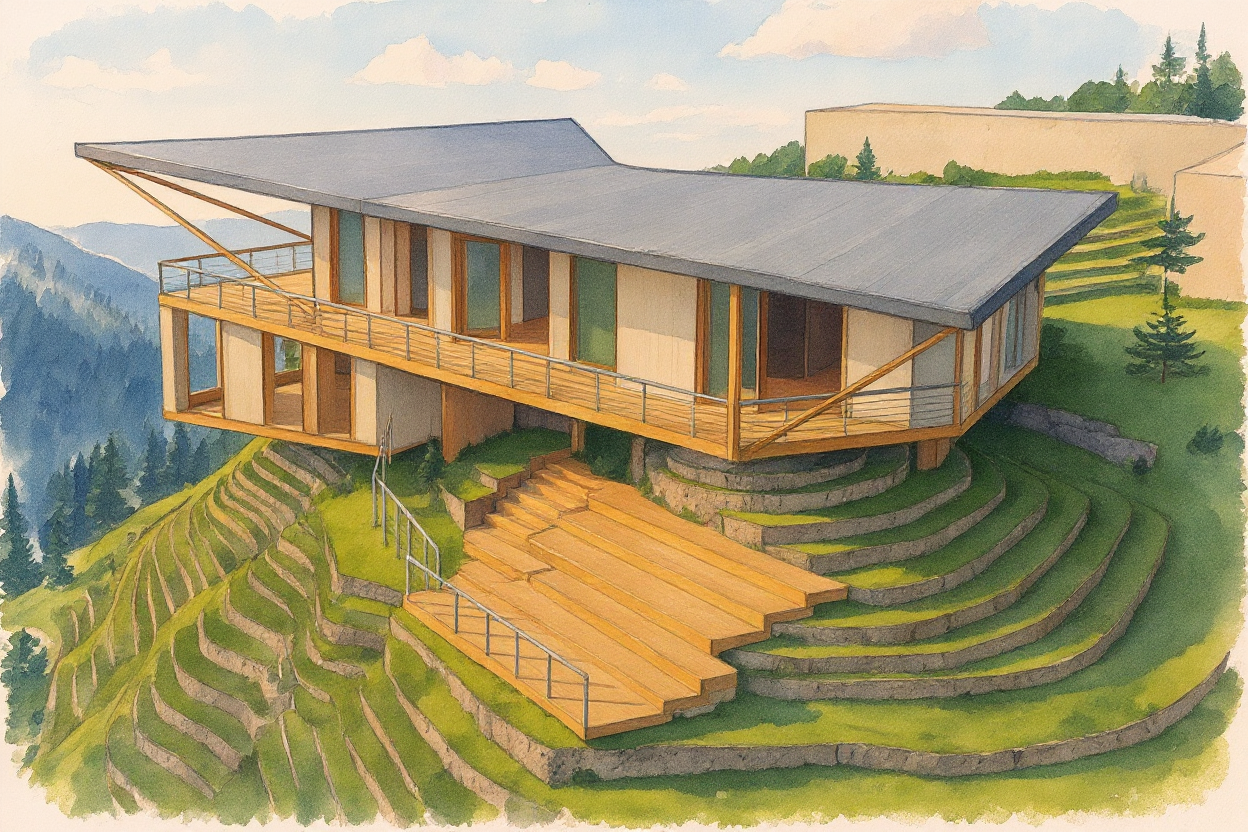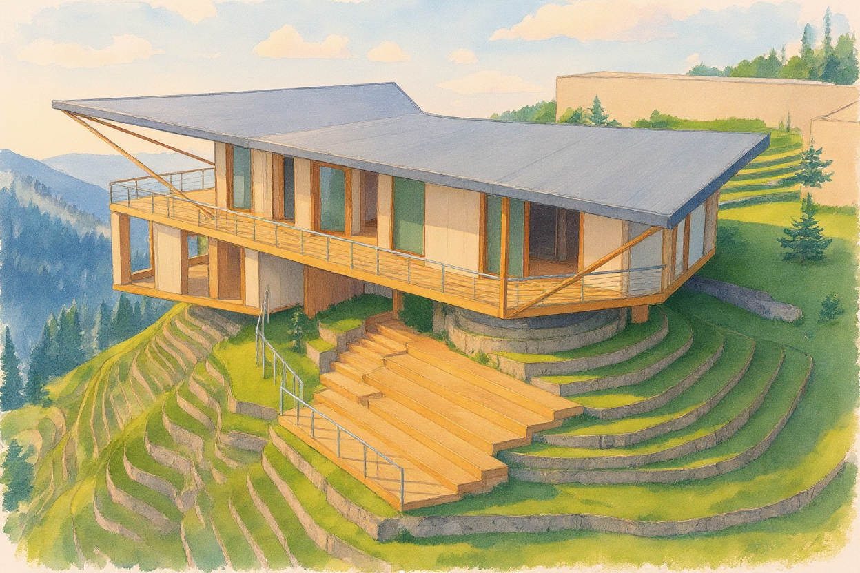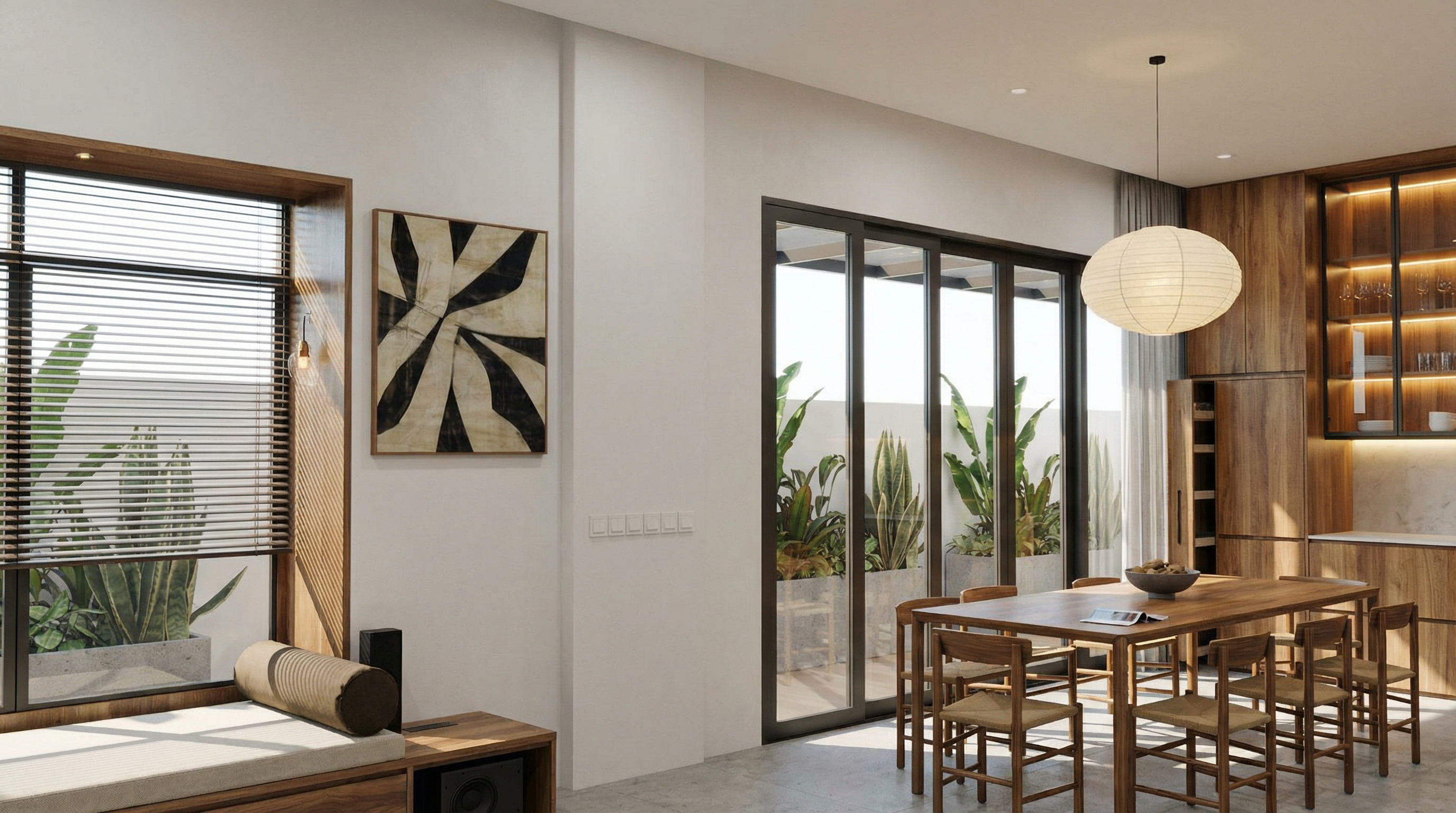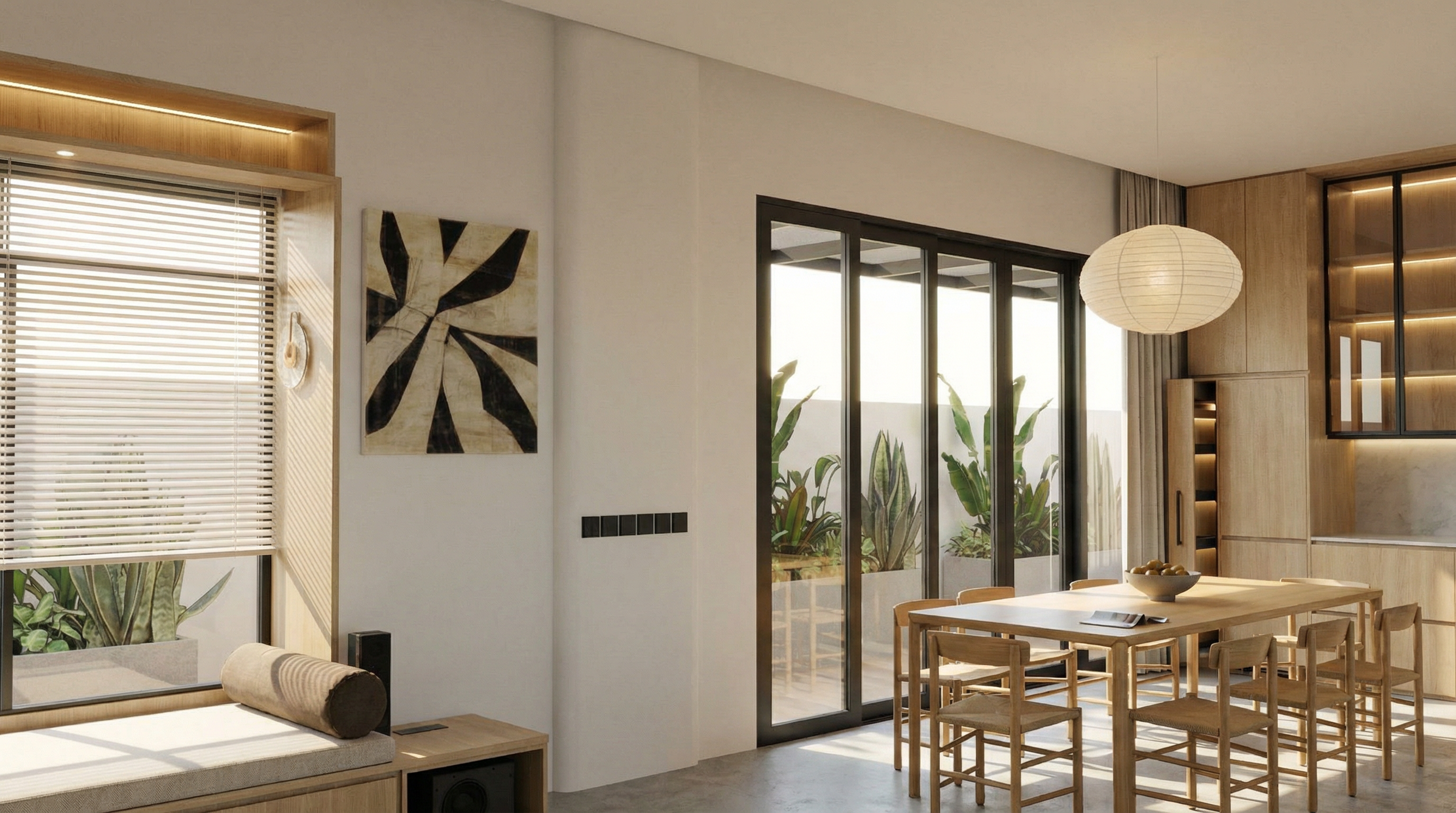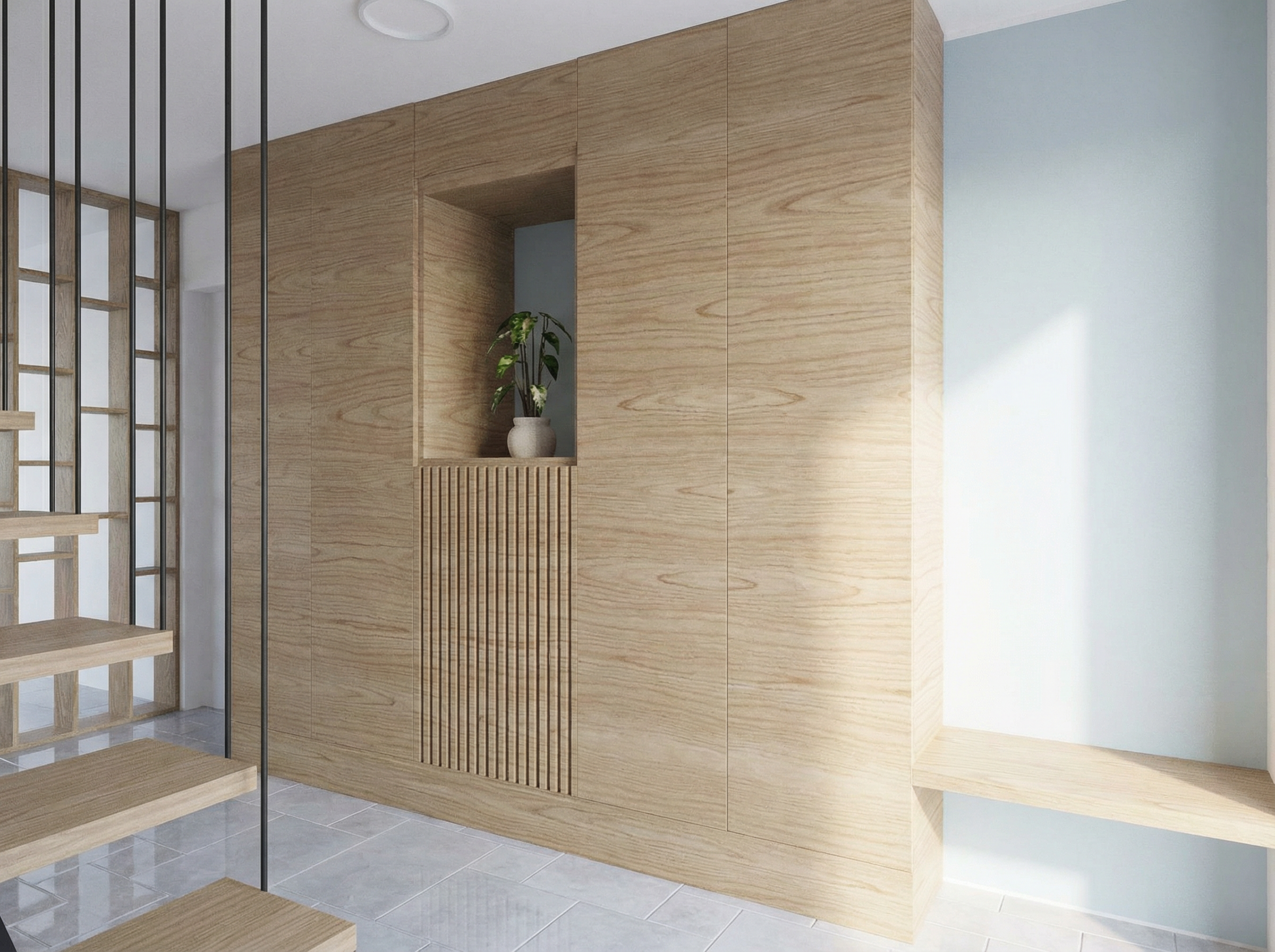 render a modern interior scene featuring a minimalist staircase with light oak wooden steps and sleek black metal railings the adjacent wall is adorned with a textured pattern in light walnut and a mirror niche illuminated from above and decorated with a small plant the door is off white with a subtle metallic handle the floor consists of a light grey matte polished marble the atmosphere is warm and inviting with soft natural lighting creating gentle shadows the right side is an empty wall covered in a mirror with a bench in front