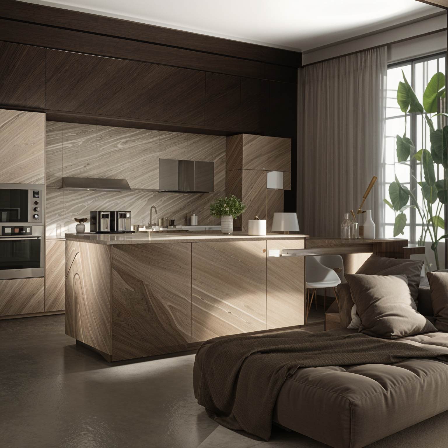 modernist interior shot render an elegant modern living room with a harmonious color palette the walls should be a soft cream providing warmth to the space feature a large plush sectional sofa in a muted taupe color the low coffee table in the center should be a rich walnut brown contrasting against a plush light beige area rug add sleek built in shelves with minimalist decor and books of various colors include a large flat screen tv on the wall and a few abstract art pieces in earthy tones use soft ambient lighting and a modern chandelier for a cozy inviting atmosphere architecture