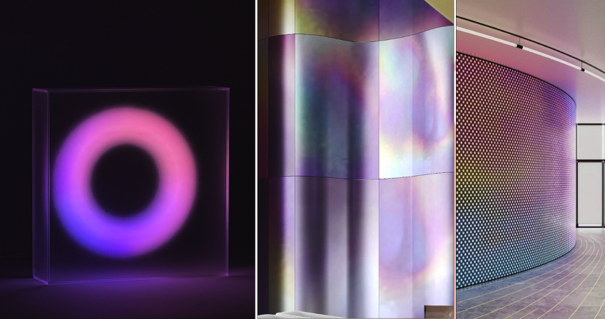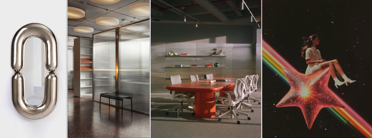 interior shot interior visualization of a modern office corridor the corridor is flanked by shelves with rounded corners on both sides with a soft seating area integrated industrial style ceiling with exposed pipes and conduits large circular ring shaped pendant lights are hanging above the corridor furniture materials metal translucent plastic orange gradient white and purple colors the floor is gray carpet tiles potted plants hanging from the ceiling dramatic lighting photorealistic 8k wide angle shot
