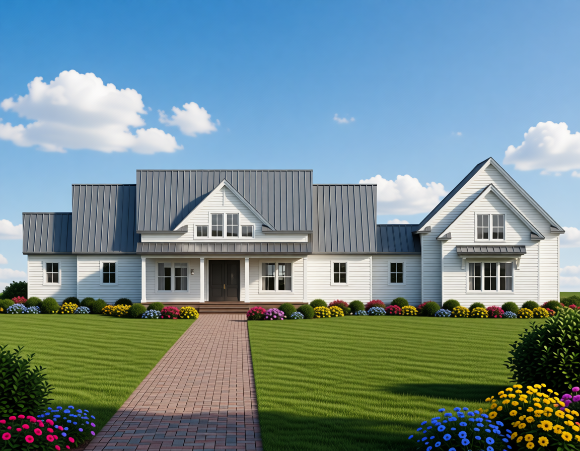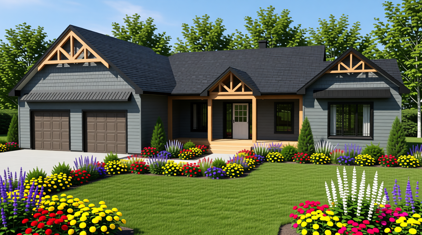 black roofing shingles black fascia dark charcoal siding black trim around doors and windows wood posts deck and gable trim trees in back flower beds in the front of house