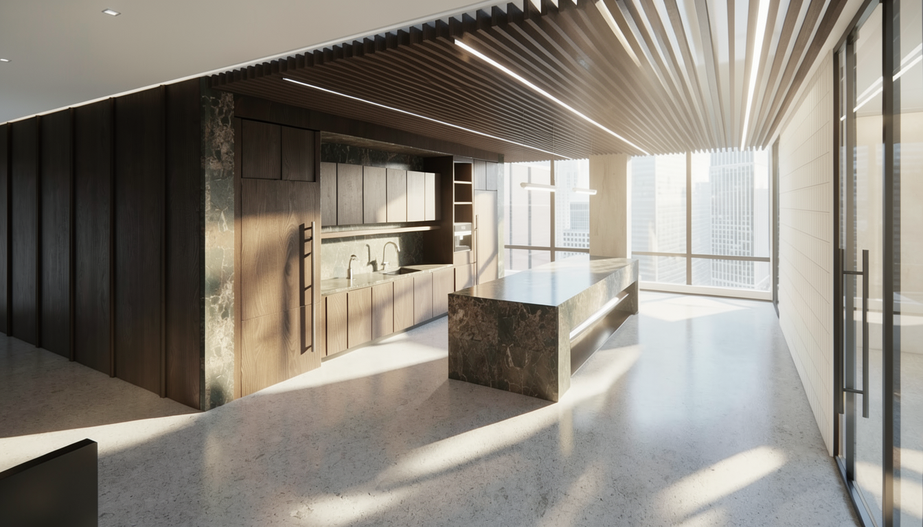 provide a photorealistic rendering keep all the elements proportions and materials as they are provide daylight through the glass only have the sun only protrude into the space about 1 add more ambient lighting to the overall interior