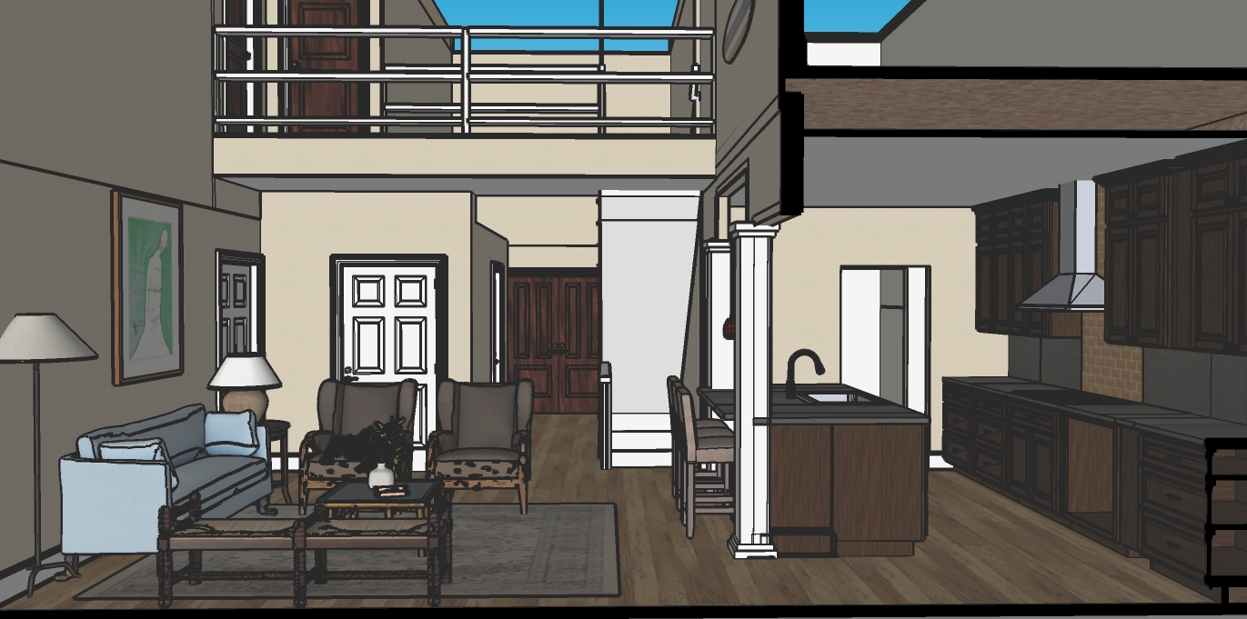add the ceiling this is angled to peak the floors are a natural maple add brightness from the windows the door and window casing is white the railing is white the kitchen backsplash is granite like the countertops except where the hood is which is a rust color mini subway tile the chairs don t have squiggle lines on them they are a brown pinstripe fabric with wood legs