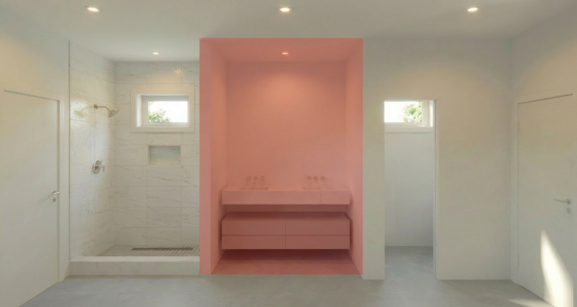 keep everything exactly the same in the rendering do not change the layout walls doors vanity fixtures shower tile windows ceiling or floor only apply tile to the highlighted wall areas around the vanity use the same tile that is currently used on the shower walls important apply tile only to the vertical wall surfaces around the vanity do not tile the vanity do not tile the floor do not tile the ceiling do not tile any other walls remove the red highlight and replace it with the shower wall tile do not change anything else in the room