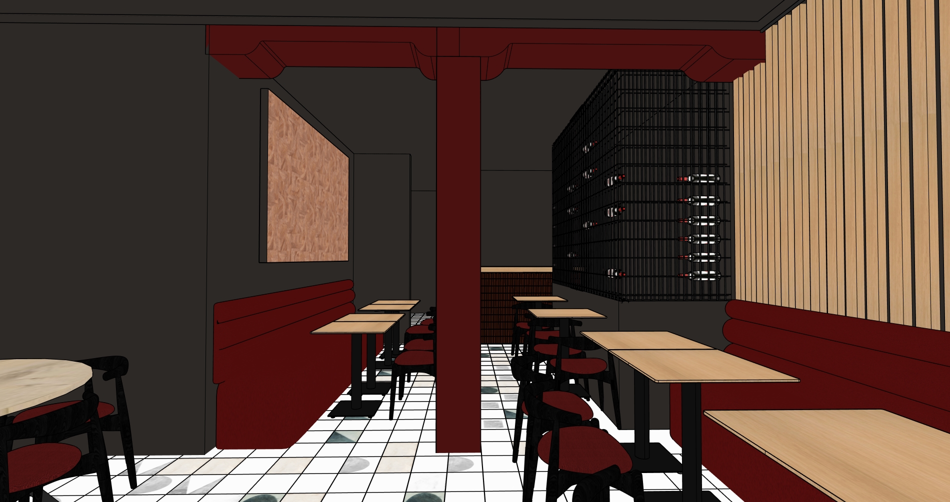 crea una imagen fotorealista a partir de esta de sketchup realza las texturas y manten un ambiente oscuro quita los fotos del techo quita la iluminacion natural que solo sea artificial
