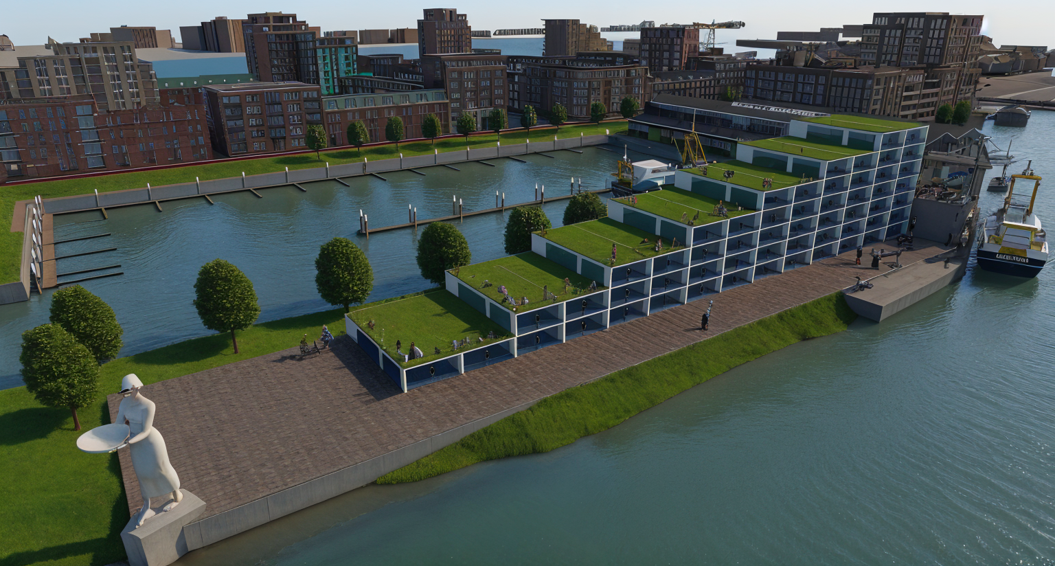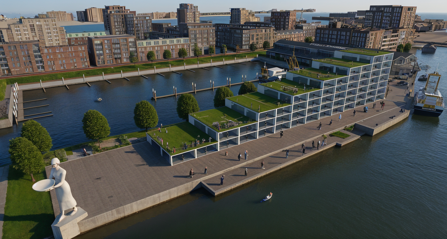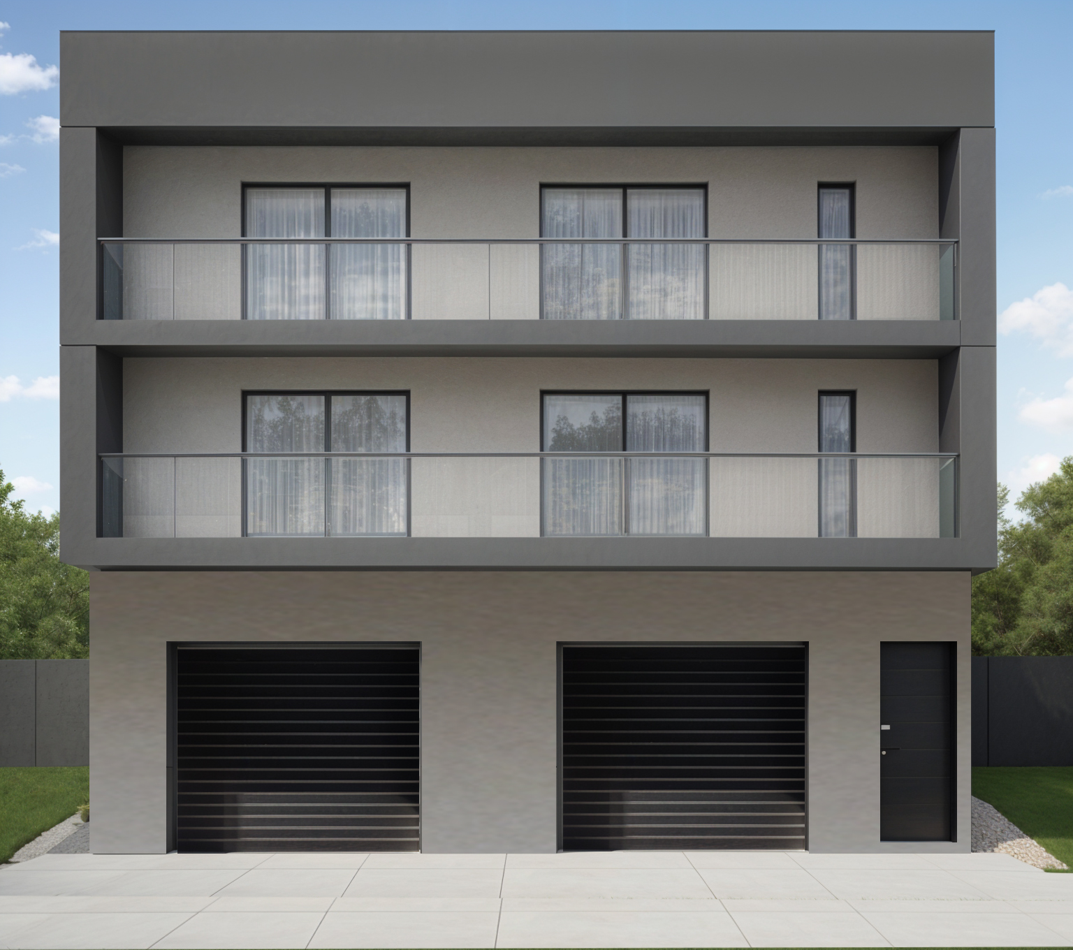 international style exterior shot modern minimalist two story building sleek gray facade large glass windows and black shuttered garage doors the structure is surrounded by lush greenery and a clear blue sky with soft white clouds the atmosphere is serene and inviting with natural light casting gentle shadows perfect balance of urban and natural elements architecture