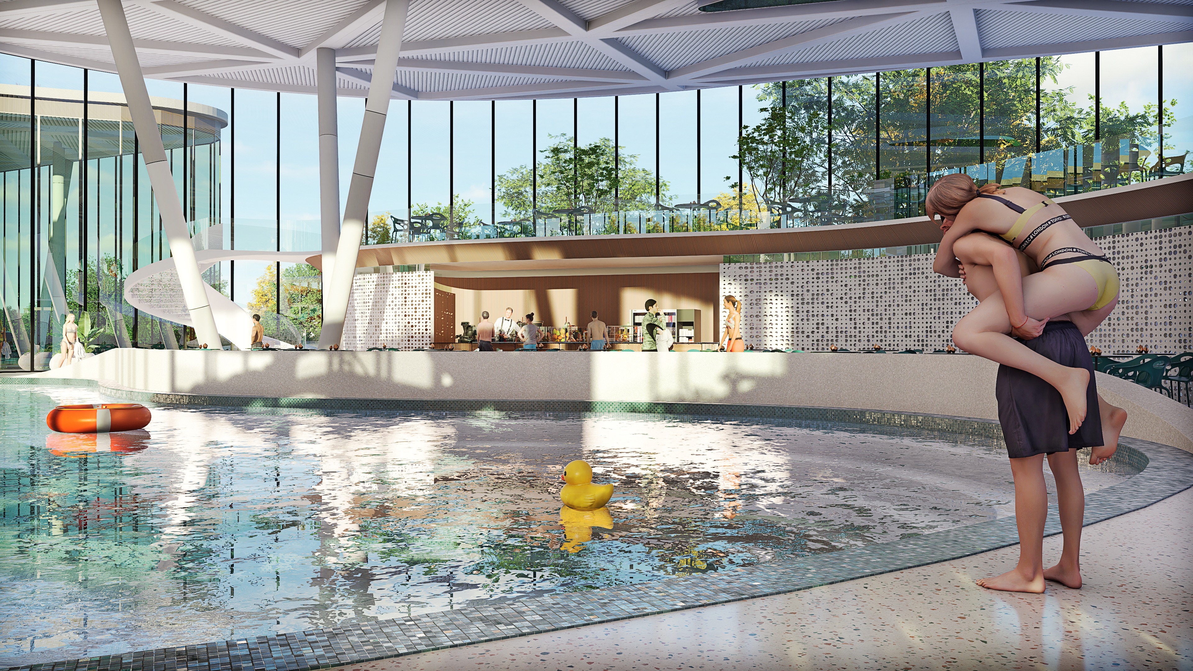 important preserve the existing geometry and the existing context exactly as provided preserve the existing windows do not add new windows do not modify alter reinterpret add remove scale or reshape any geometry do not change the site surroundings street layout neighboring buildings vegetation or context elements do not modify geometry scale proportions buildings road layout sidewalks or surrounding context in any way do not modify text soft sunny noon atmosphere diffused neutral natural daylight with subtle tones cinematic architectural mood weak interior lighting 4000k slight glowing from inside large glass surfaces with realistic reflections soft mirror effect environmental reflections of sky and surroundings important do not add new windows remove the people