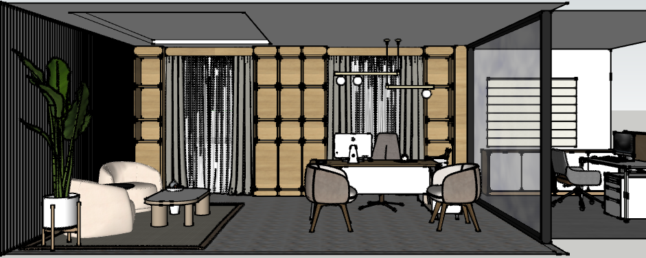 an executive office in a touch of elegance and cozyness render in a realistic render floor is terrazo do not change any furniture and structure add ceiling lighting curtains in white render in bright setting