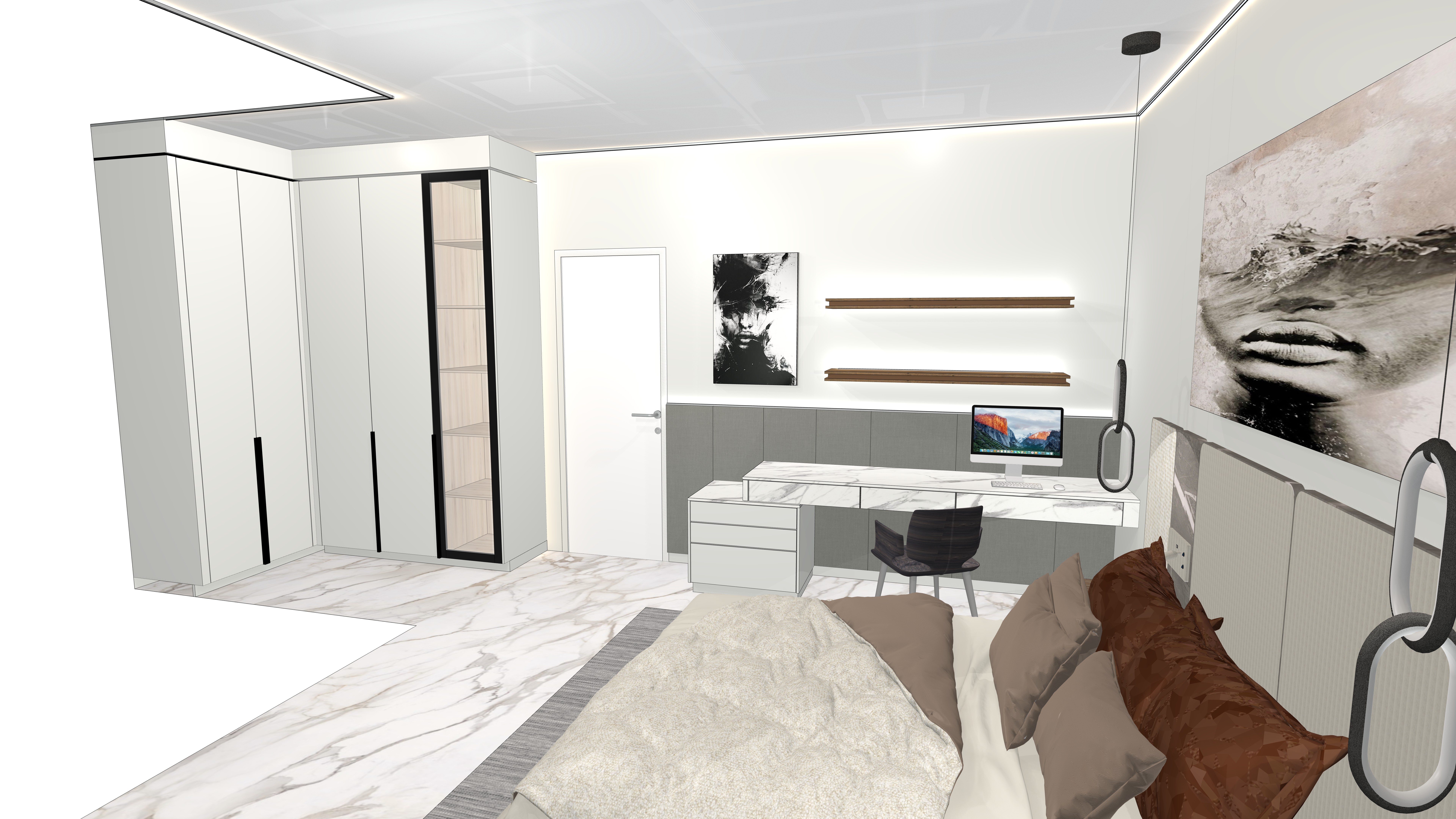 realistically render a bright bedroom with soft lighting the glass wardrobe must be grey tint glass with one internal vertical led light add shelves decor