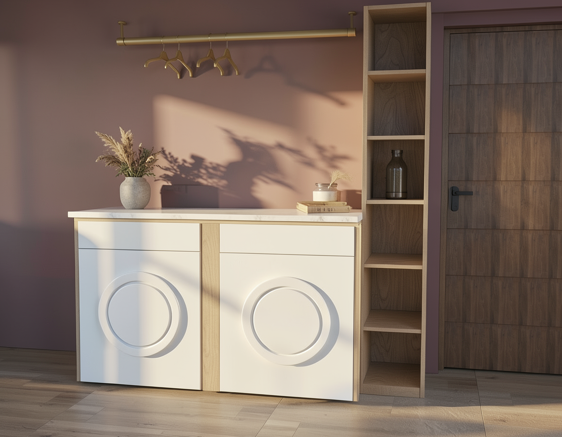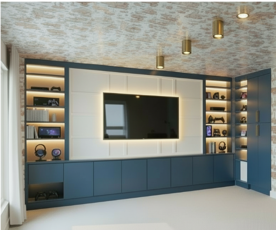 update the rendering while keeping the cabinetry wallpaper lighting style and overall layout the same ceiling lighting layout reposition the recessed ceiling lights so they form a clean symmetrical grid around the tv wall the recessed can lights should flank the tv feature wall evenly positioned midway between the edge of the tv wall panel and the tall cabinet towers on each side the lights should be evenly spaced and aligned with the tv wall to create a balanced lighting layout corner shelving modify the shelving on the right side so the floating shelves wrap the corner in a continuous l shape the shelves should extend from the main tv wall shelving and continue onto the adjacent wall the shelf spacing and thickness should match the shelves on the tv wall the bottom portion should include a cabinet door matching the base cabinetry so the shelving transitions into the cabinet below maintain the illuminated shelves gaming accessories styling tv backlighting brass ceiling fixtures wallpapered ceiling and walls and overall room design