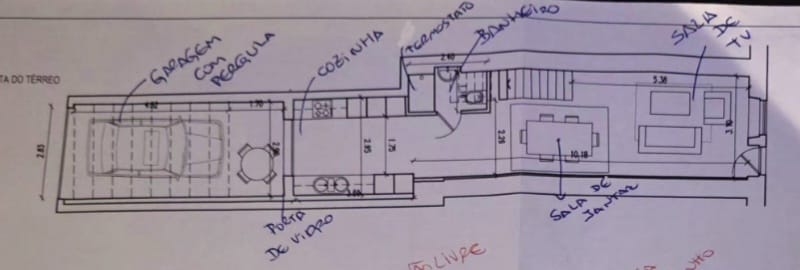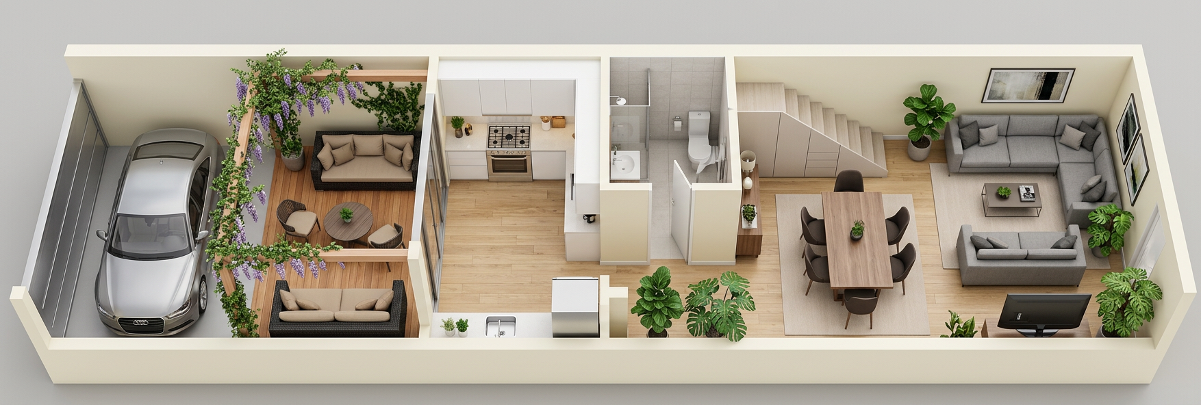 render in high quality a humanized 3d floor plan architectural axonometric view based on the provided print the scene must faithfully reproduce the design shown without altering geometry proportions layout of the spaces or the reading angle of the plan transform the technical drawing into a clear and realistic three dimensional representation of a long narrow single story residence organized in a linear sequence the composition should show from left to right covered garage with pergola access to the interior area compact kitchen small technical support bathroom core central circulation with staircase social area with dining table and finally a tv living room maintain the architectural reading of the original plan with walls openings doors and divisions exactly where they appear in the drawing apply realistic and contemporary materials walls in matte white paint flooring in light cement porcelain tile or satin polished concrete metallic or light wood structure in the garage pergola matte black aluminum frames transparent glass in enclosures countertops in light stone in the kitchen and wet areas insert furniture only as visual support for spatial reading respecting the positioning indicated in the plan car in the garage small round table near the kitchen rectangular dining table in the social area and sofas in the tv room the visual language should be clean elegant and architectural with a contemporary and minimalist aesthetic show simple volumetry straight lines longitudinal circulation and integration between social spaces use diffused natural lighting with the appearance of a professional render soft shadows ambient occlusion subtle reflections on glass and materials with realistic physical texture camera in axonometric or elevated isometric perspective view like a presentation electronic model allowing the understanding of the entire internal organization of the project photorealistic quality high level architectural render pbr materials sharp definition soft depth balanced natural light clean and professional atmosphere the background should be neutral and discreet maintaining coherence with the architectural presentation without adding new volumes or elements that are not visible in the original drawing