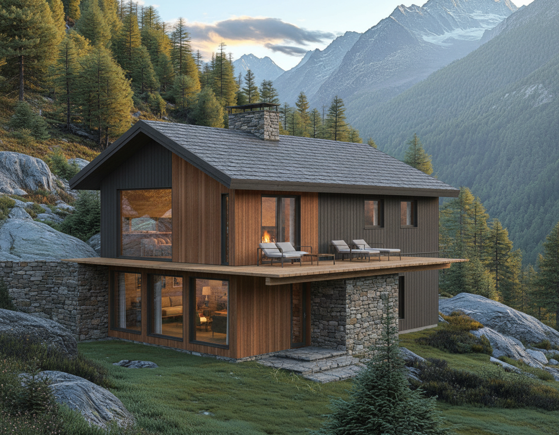keep the same texture and vibe as well as colors just at the terace the standing should be with two wooden colums and the part with stones remove it