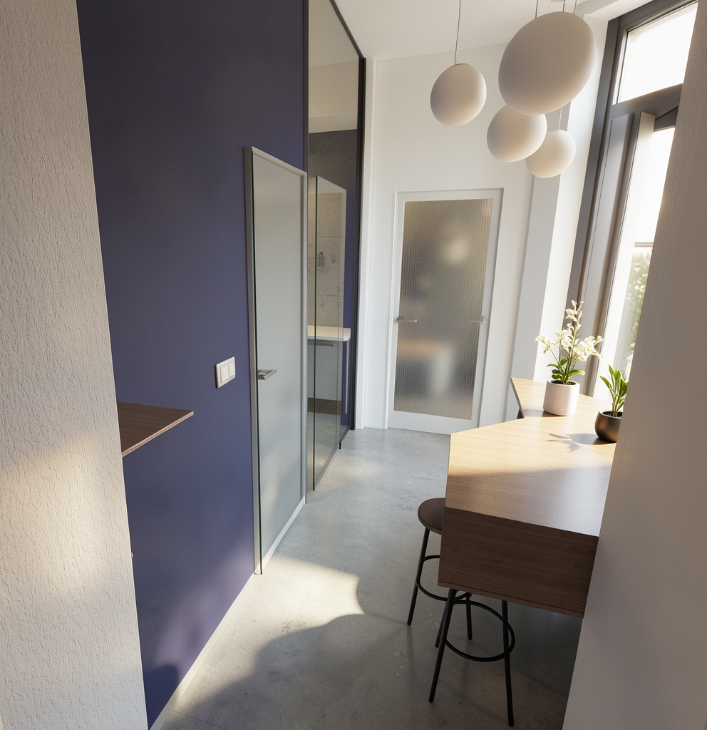 solid medium wood cabinets with white arch and light marble backsplash