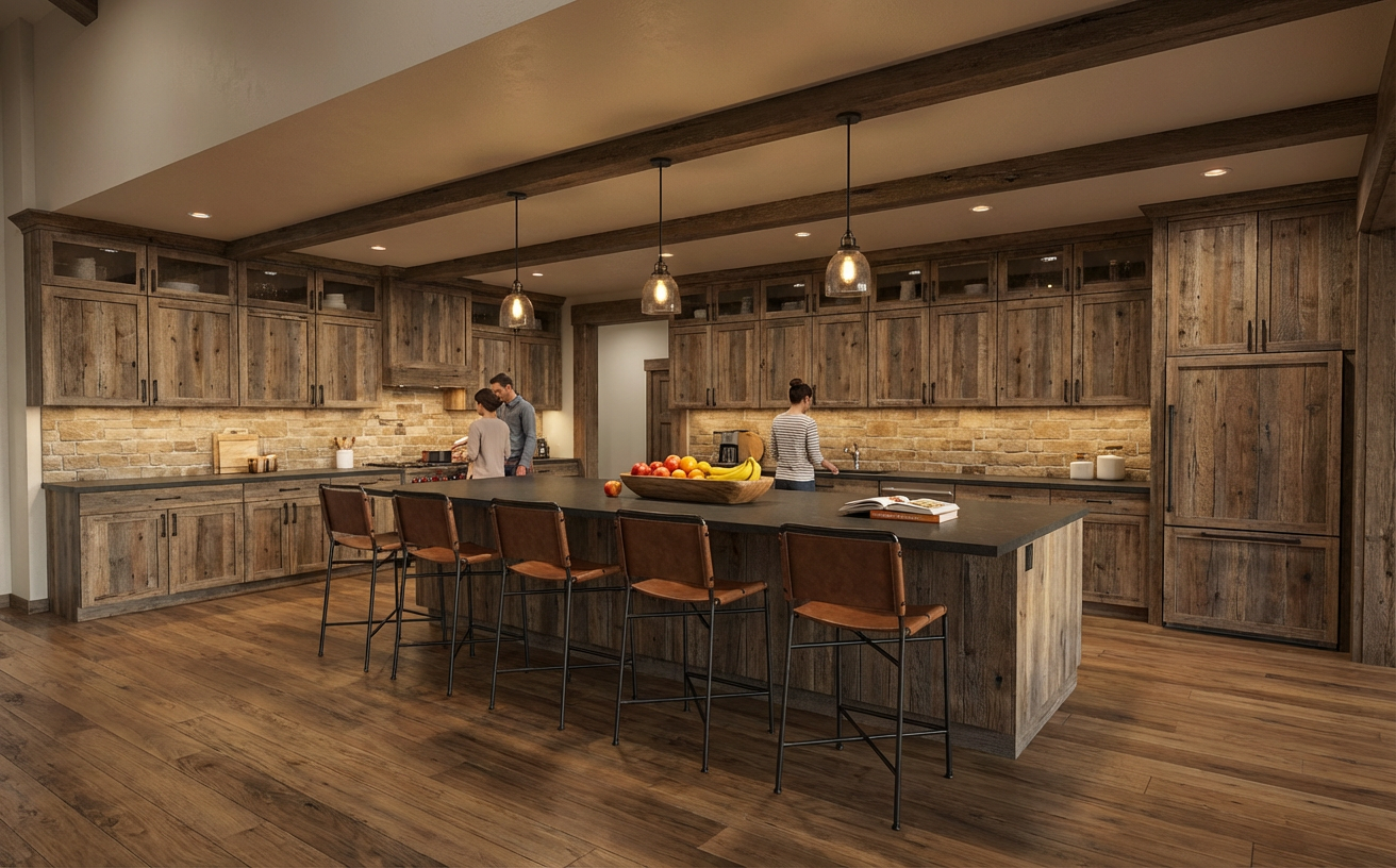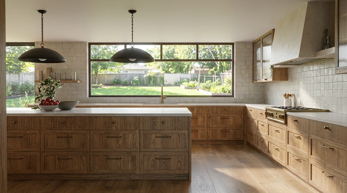 view out window should be a suburban backyard upper cabinets are reeded glass light oak wood tones backsplash tile is vertical rectangles stacked with matt finish