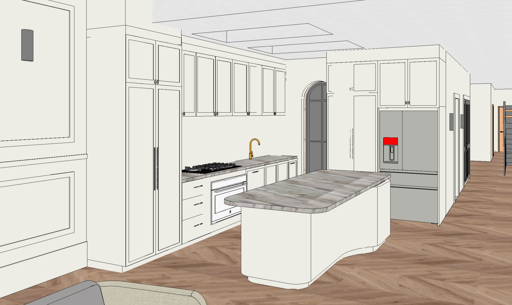 casper white quarter walls joinery wainscotting alabaster wall light stainless steel fridge chevron floor brass sink tap black steel rear arch door to courtyard