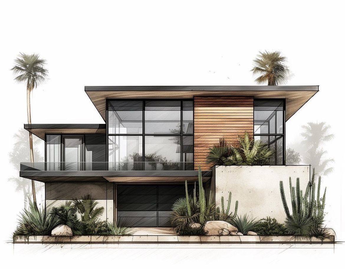 modernist exterior shot use the main image as the only content source preserve architecture proportions geometry and perspective exactly convert the image into a hand drawn architectural sketch visible line variation pencil fineliner texture light hatching no redesign no geometry changes architecture