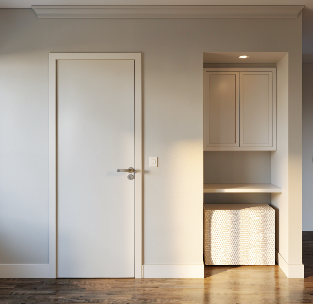 add a crown molding trim piece above the cabinet to bridge the gap between the cabinet and the ceiling creating a built in look the crown should run the full width of the cabinet and match the cabinet color and finish transform the box on the lower right side into a built in dog crate replace the front face with a framed opening and a metal kennel style bar door with evenly spaced vertical bars and a small latch keep the surrounding cabinet structure add concealed under cabinet lighting so soft light glows from beneath the cabinet and beneath the shelf illuminating the surfaces below the lighting should be subtle warm and integrated so the light source itself is hidden preserve the existing design materials colors and textures treat the original image as the reference and only apply these modifications