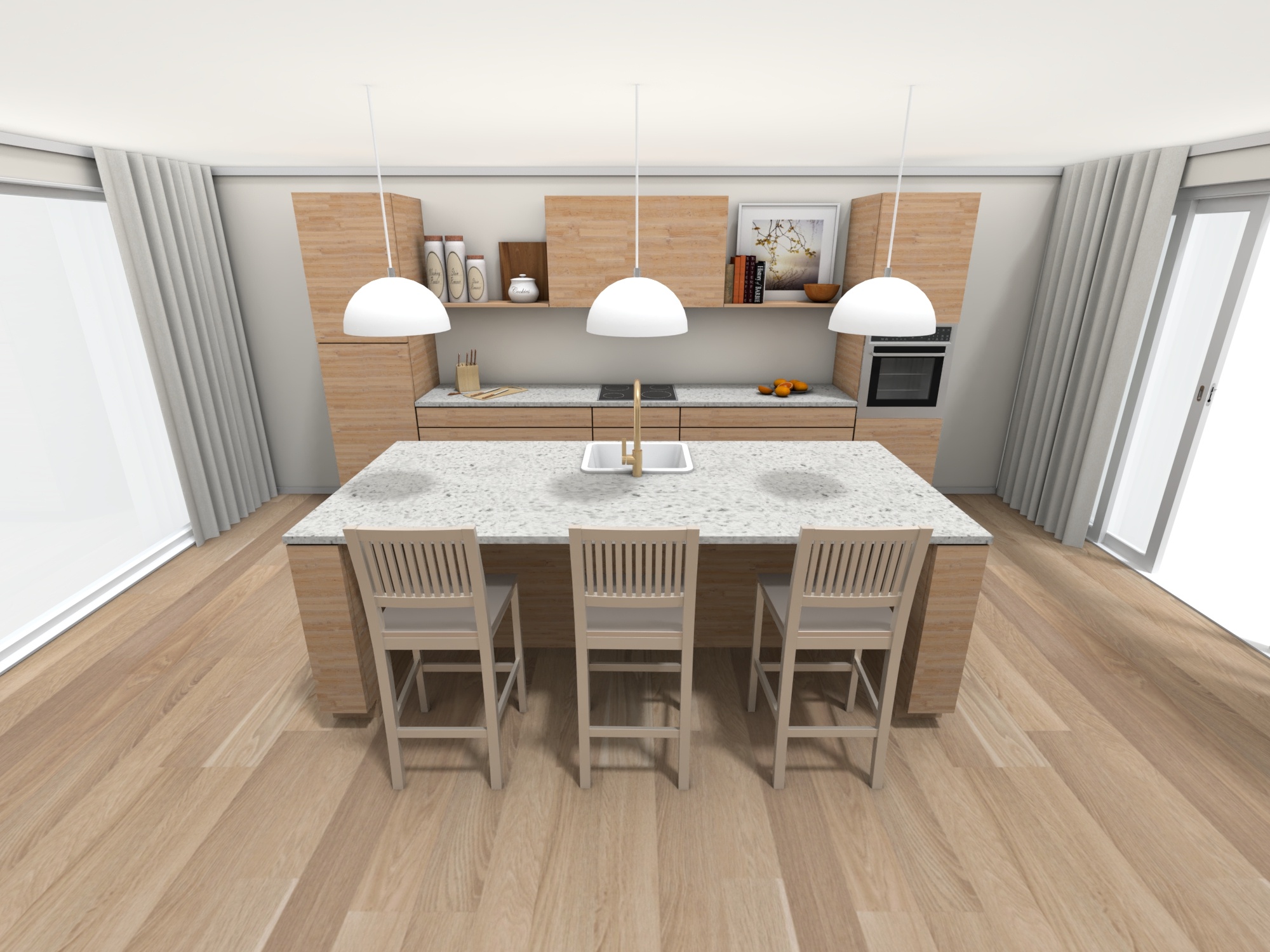 a modern and minimalist kitchen with a large kitchen island at the center the island has marble countertops and is equipped with bar stools providing seating for three the cabinetry around the island is made of light colored wood offering a natural and sleek aesthetic above the island there are three pendant lights with white globes providing ambient lighting the kitchen is designed with neutral tones throughout including beige and light wood accents contributing to a fresh and airy feel in the background there is a wall mounted open shelf with decorative items like books and small kitchen tools the room has large windows letting in natural light and there are light gray curtains hanging at the sides adding texture to the space the kitchen also features modern appliances including an oven and a cooktop integrated seamlessly into the design this is a spacious clean and well lit kitchen with an emphasis on simplicity and functionality architecture