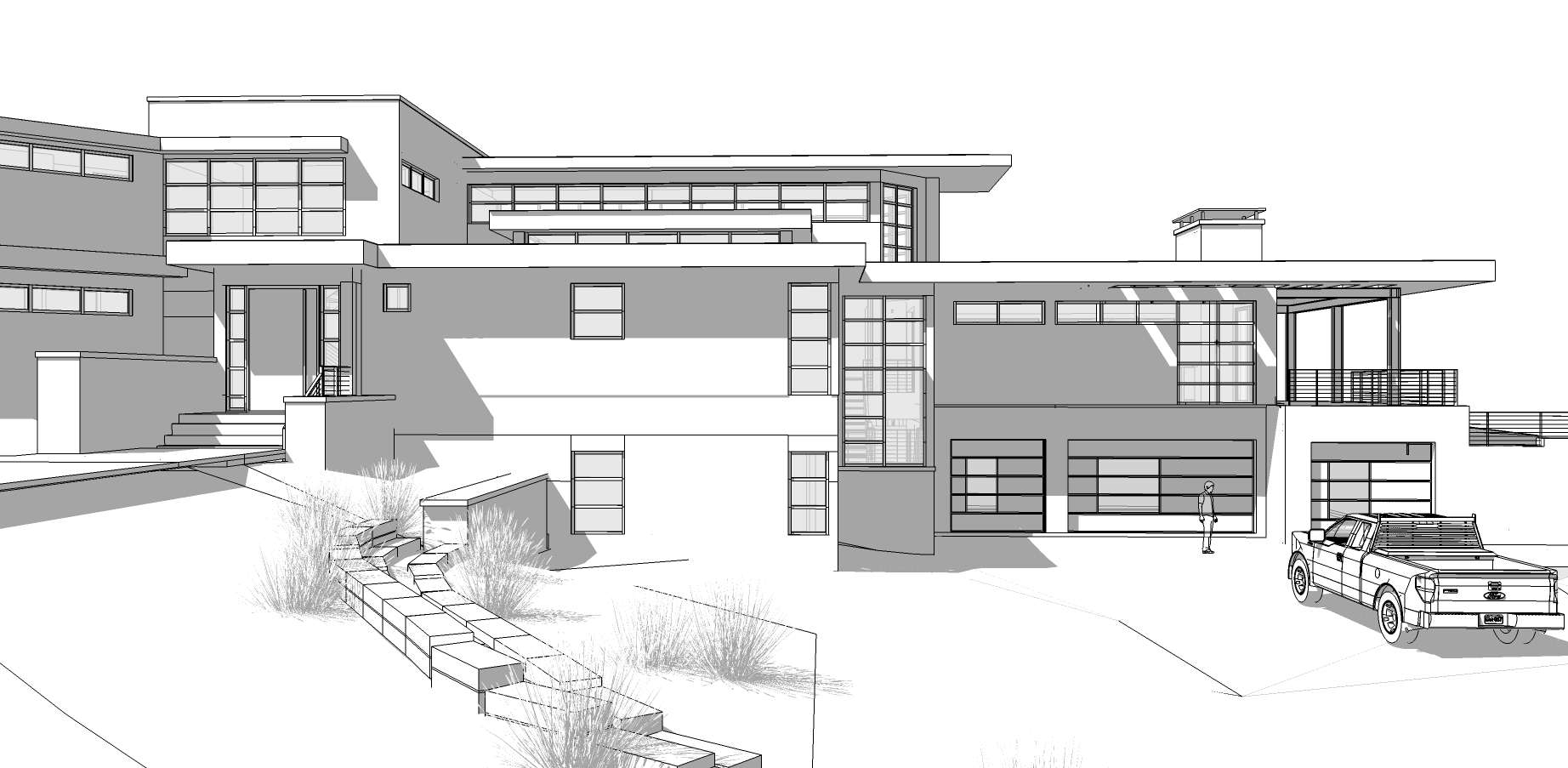 industrial home design vertical dark wood shiplap matte black metal panels black fascia tall grass foreground fog dusk