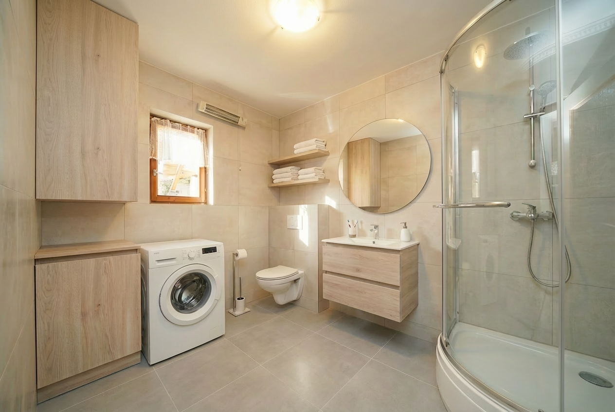 vykresli sk vlevo naho e jako kryt na kotel kter m jednok dl dv ka s r mem v barv b len dub a v pl tvo tahokov v barv st brn za nimi je kv rami vid t n st nn kotel vykresli dla bu v odst nu cementi vykresli obklad v barv b l