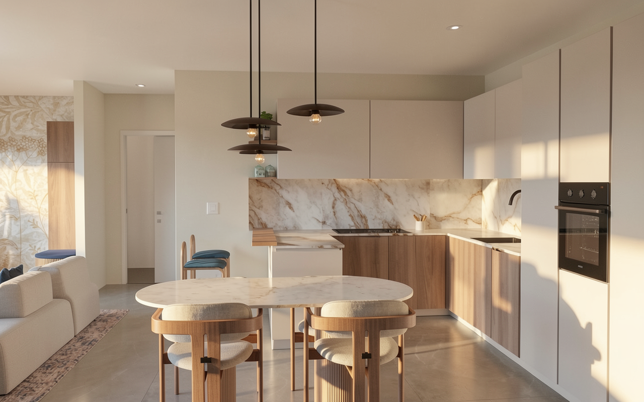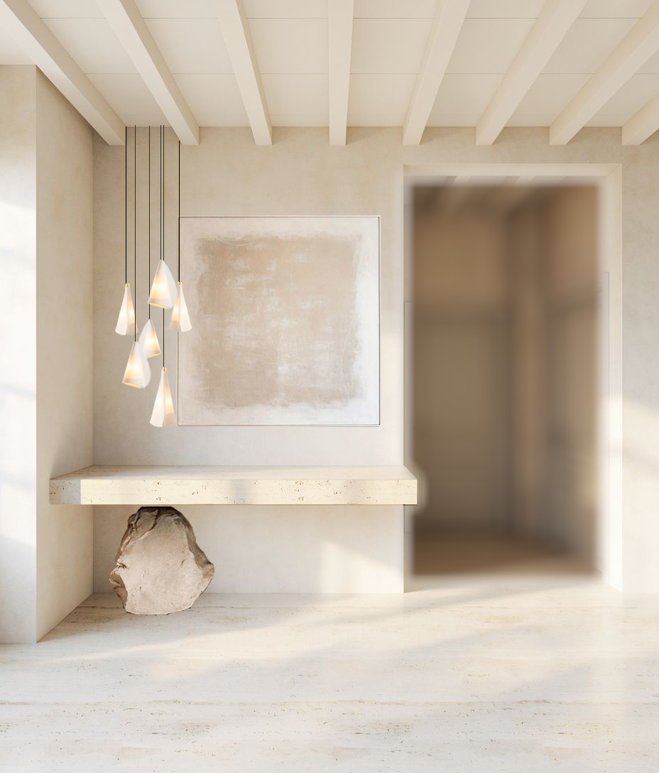 create a high resolution home entrance the stone leg of the table is travertino light beige texture in the shape you see on the right as you see the hall is blur off white basic color