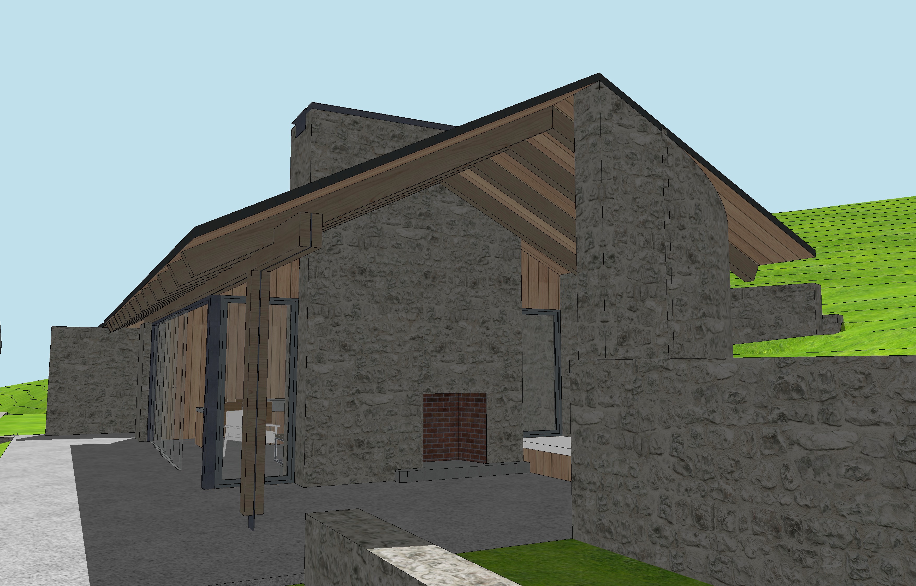 hilly landscape with sagebrush and tall wild grasses brown drystack stone walls corten standing seam metal roof clouds in the sky make all glass reflective such that one can not see into house add fire to fireplace