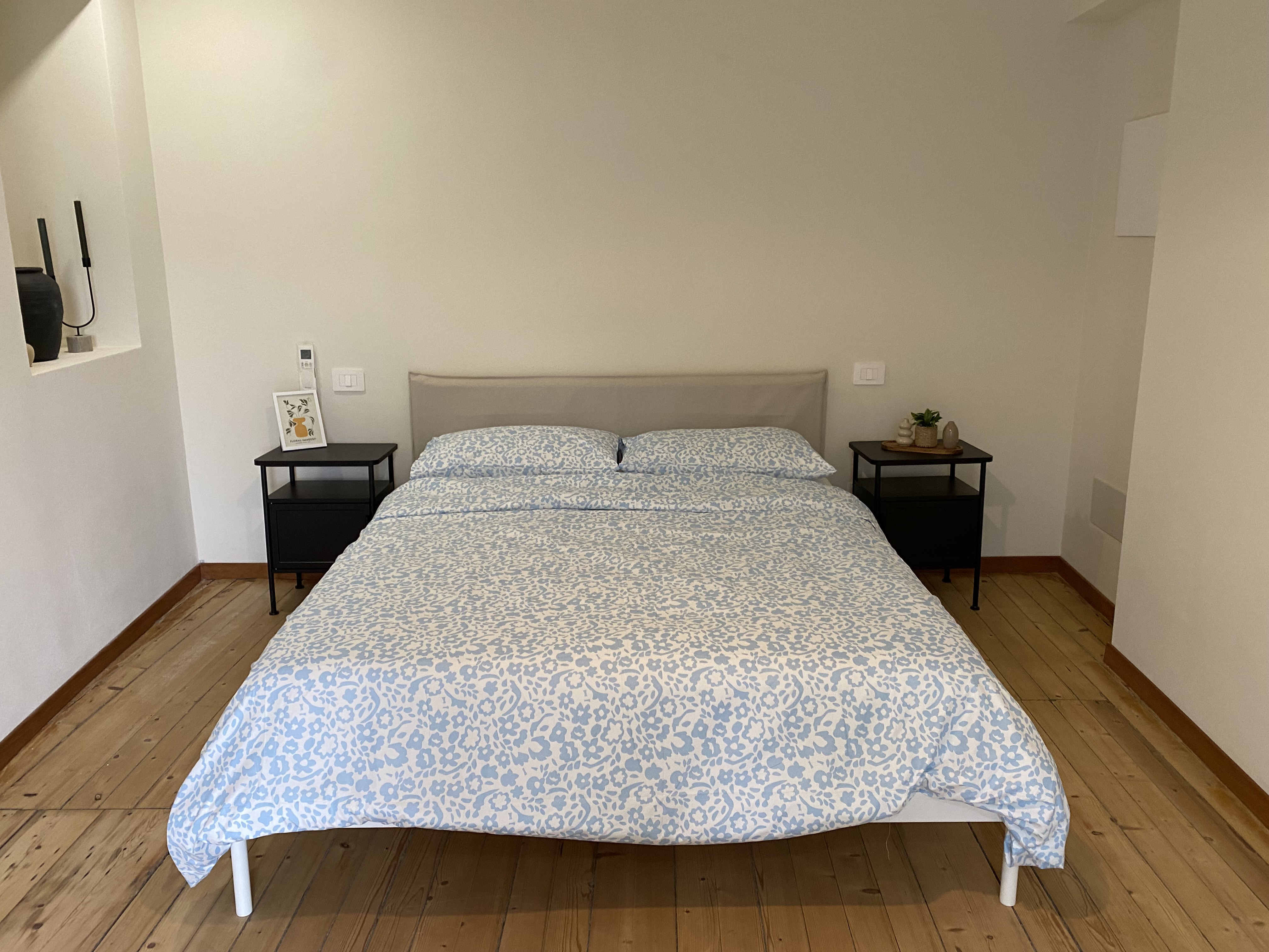this is a real photo of a bedroom preserve the exact architecture walls ceiling window door and camera angle transform the space into a warm high end airbnb style bedroom inspired by mediterranean scandinavian design style goal cozy natural soft minimal warm beige tones like a boutique hotel bed area upgrade bedding to layered neutral textiles base soft beige cream duvet add textured throw blanket in warm sand color add multiple pillows in linen textures beige light taupe make the bed look plush full and inviting not flat floor add a large natural woven rug jute or beige under the bed lighting add two warm bedside lamps on both nightstands soft yellow light create a cozy ambient glow no harsh white light furniture additions add a wooden bench at the foot of the bed place 1 2 woven baskets under or near the bench keep furniture minimal and premium looking decor add a large horizontal framed artwork above the bed landscape neutral tones add a tall natural plant in a woven basket subtle not too big add small decor items on nightstands ceramic books candle materials emphasize natural materials wood linen cotton wicker warm up wood tones slightly light soft warm daylight cozy interior lighting balanced slightly golden tone important do not change layout or structure keep original bed and furniture positions do not overcrowd the room the final result should look like a professionally styled airbnb bedroom warm inviting natural and realistic