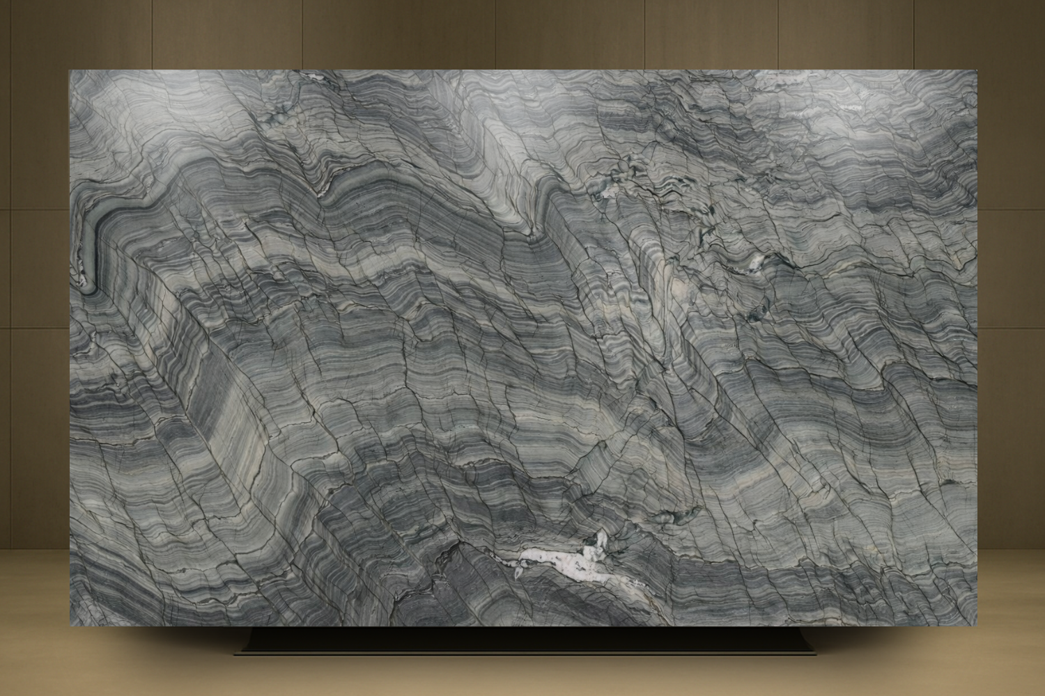 create an outdoor moodboard based around this slab of michelangelo quartzite include terracotta outdoor fabrics wood and stone