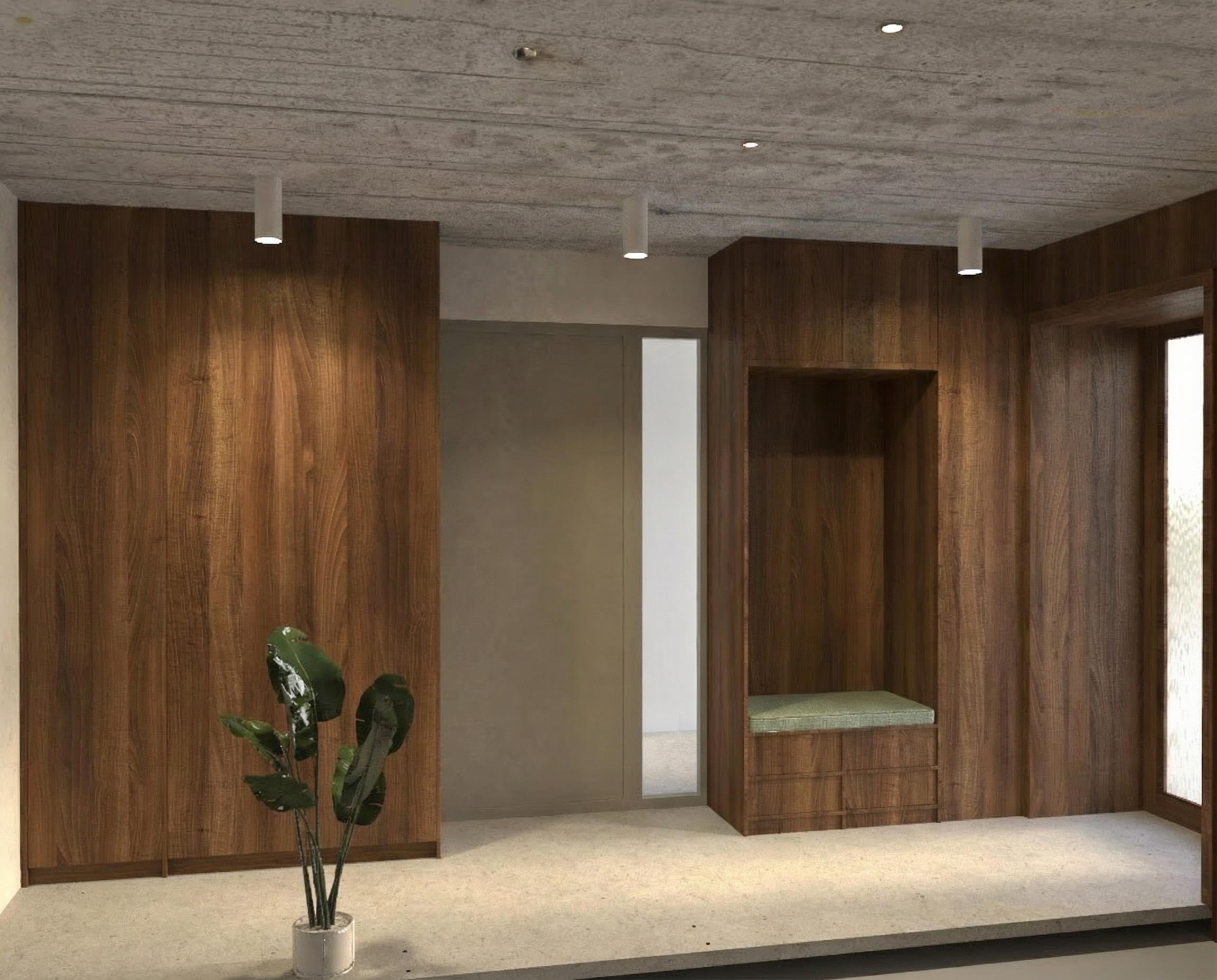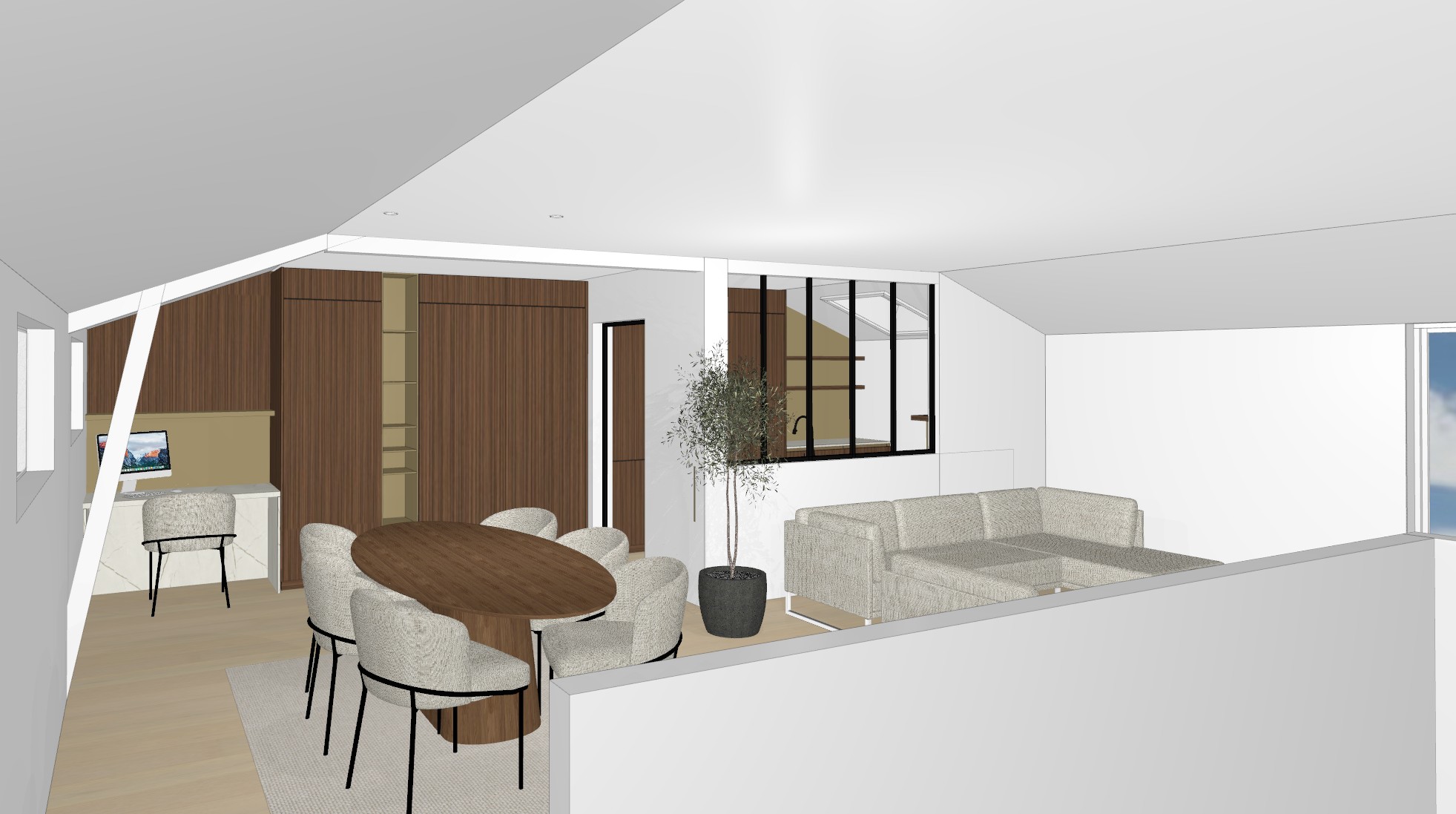 render a modern elegant living and dining room with soft ambient lighting use a warm neutral palette walls painted in off white the ceiling smooth matte white incorporate a light oak hardwood floor feature a round wooden dining table in rich walnut brown surrounded by upholstered chairs in soft beige fabric decorate with a large plush sectional sofa in light stone gray the curtains are sheer white allowing natural light to filter through add indoor plants in charcoal gray pots for a touch of greenery create a cozy inviting atmosphere that is sophisticated yet comfortable
