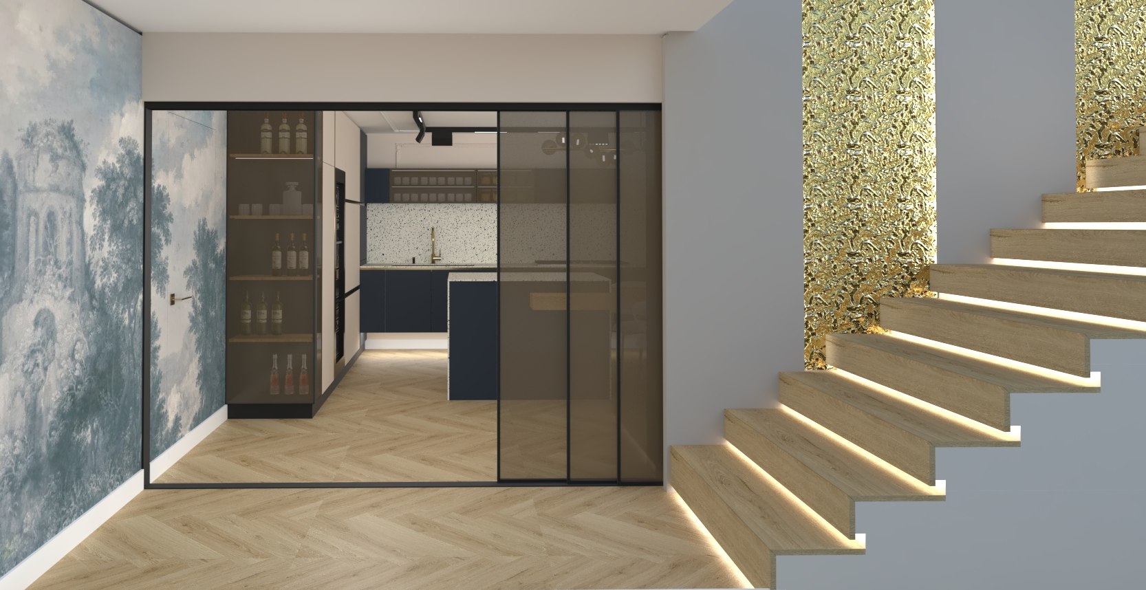 the panels on the staircase have a golden finish with a water texture the stairs are wood the glass door has clear glass