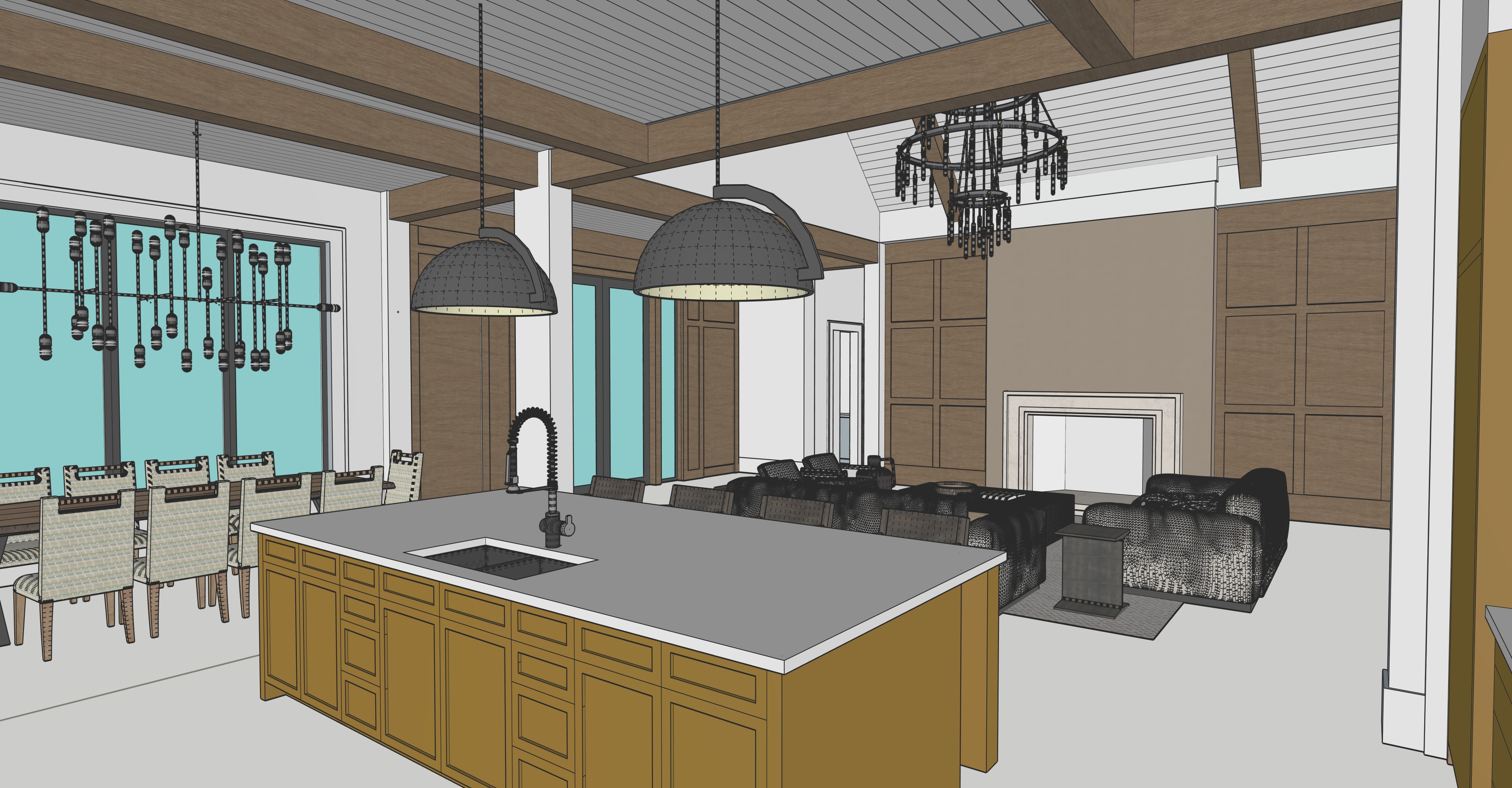 add texture and tone of reference image to fireplace flat ceilings in foreground to be painted t g vaulted ceiling above fireplace to be stained t g lighter tone wood panels beams and flooring