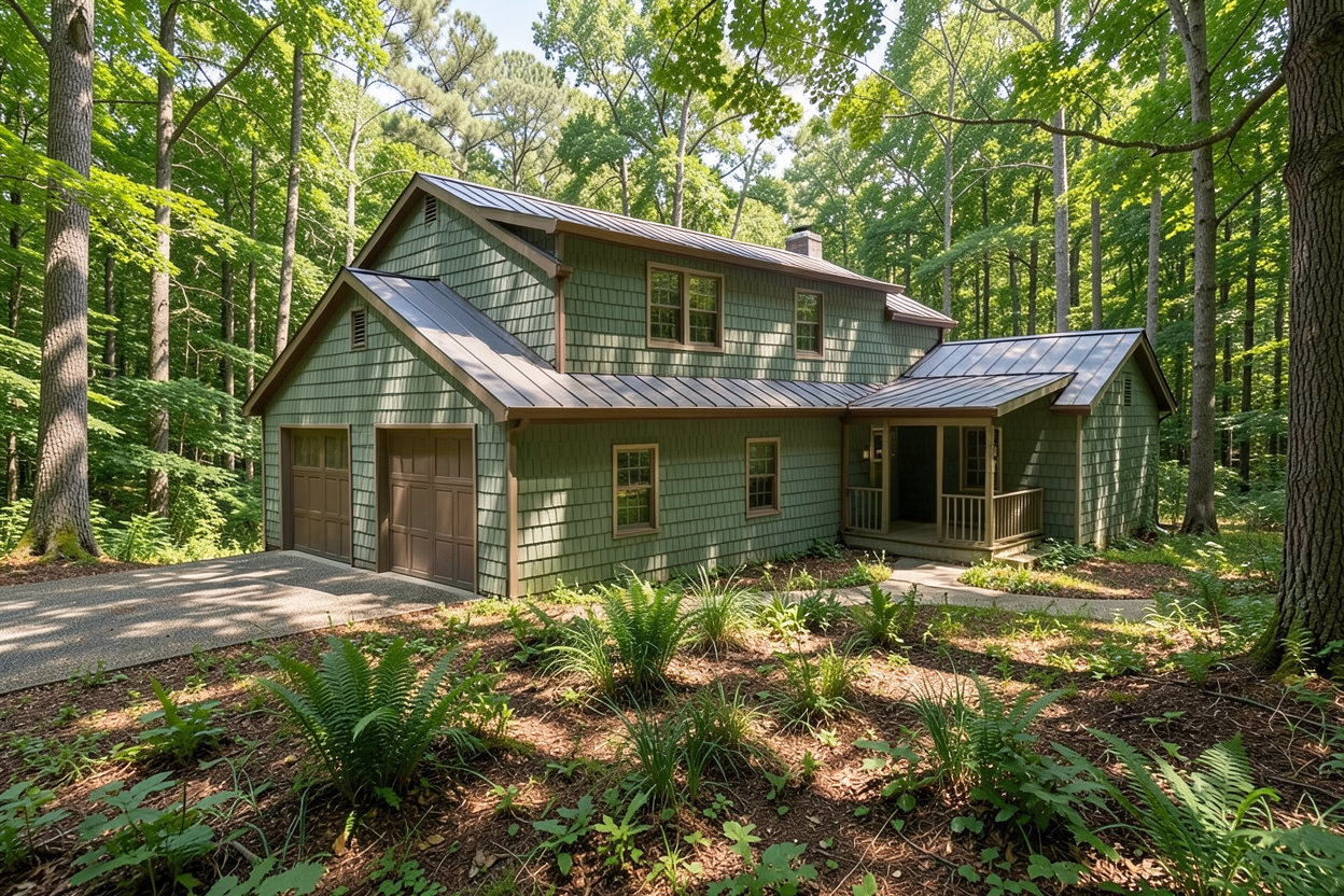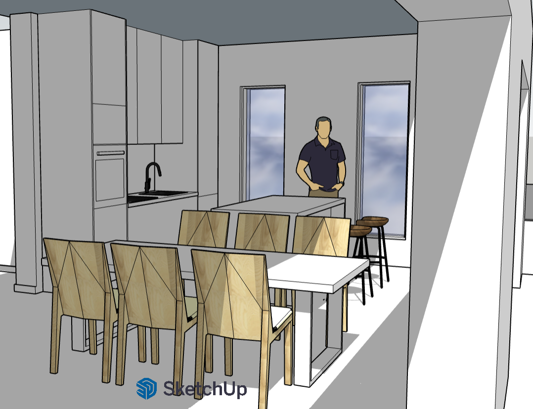 kitchen color is casmere and kitchen island put in cement color floor is wooden put three hanging light above kitchen island dinner tables legs are black color metal chair put some modern one this view is from the balcony throught the balcony doors put some shadows and also modern hanging light above table