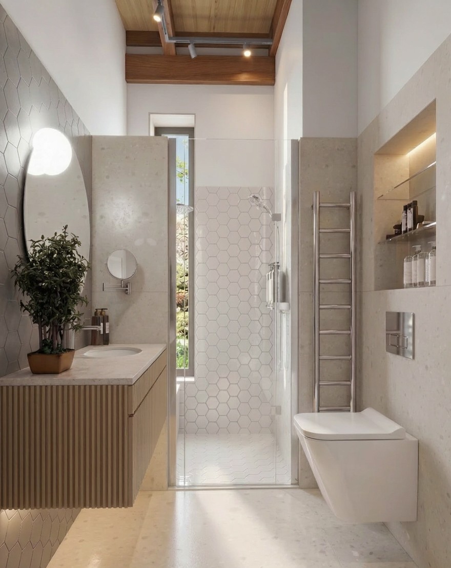 exterior shot create a professional interior design mood board for a modern bathroom combining natural materilas with contemporary furniture use a cohesive neutral color palette include key elements like furniture lighting textures adn decor and add simple conceptual sketches to show layout and design intent
