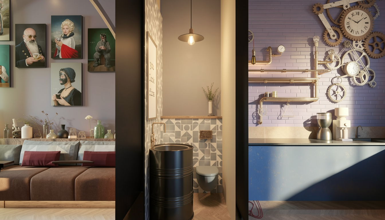 maintain all colours and architectural elements terracotta floor tile to be matte with slight sheen patterned rug and sculptural seating to appear soft enhance realism of lighting materials and people daylight entering from left striped pendant glass globe lights should have a soft glow vase has pink tulips inside nespresso coffee machine sits on counter