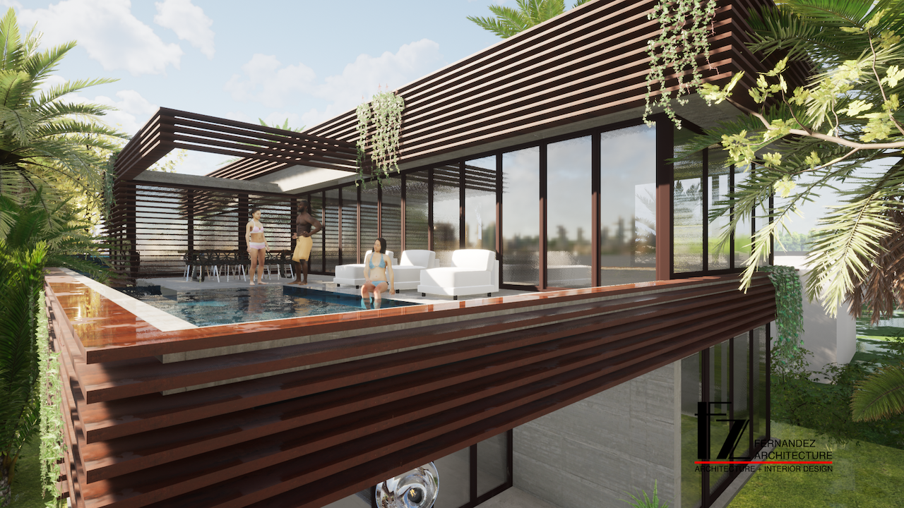 render a modern architectural house nestled amidst lush greenery use soft beige and cream tones for the house facade and emphasize reflective black tinted glass windows enhance the vibrant greenery with deep emerald and forest green hues depict strong mature trees with textured bark in rich browns and leaves in lively greens include a sleek ocean blue car in the driveway for contrast capture the bright midday atmosphere with a clear azure sky ensuring soft sunlight creates gentle shadows on the house and surrounding garden