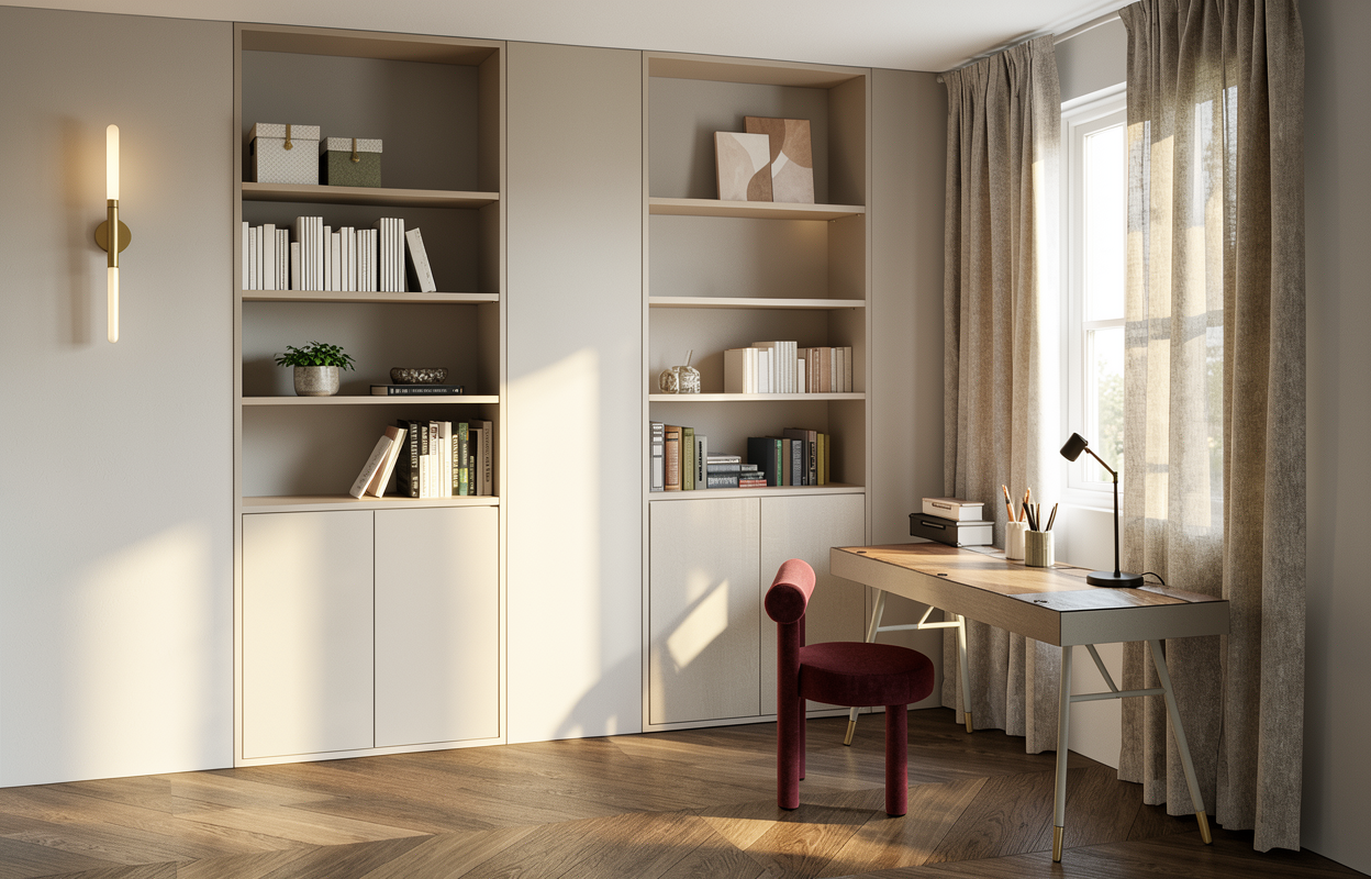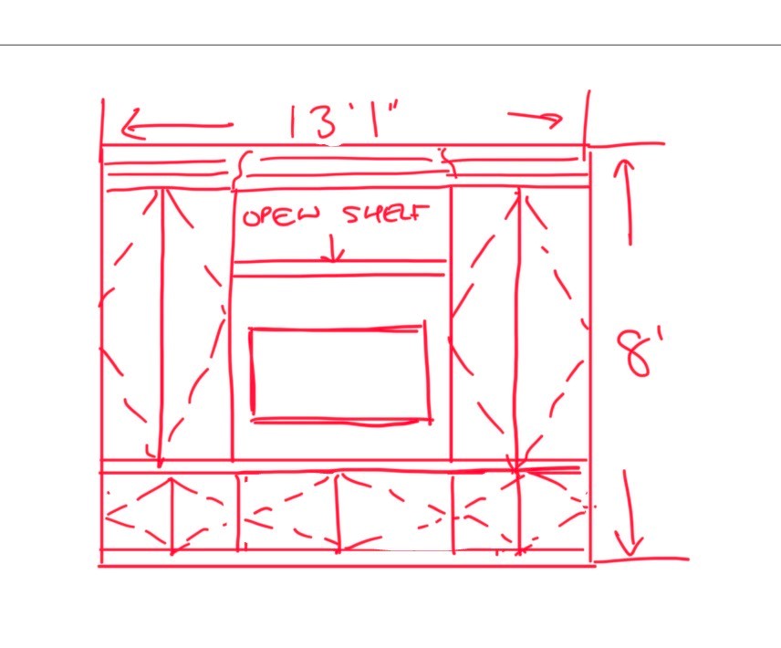 white built in cabinetry with shaker doors and white oak top on base cabinets one light oak floating shelf above wall mounted tv