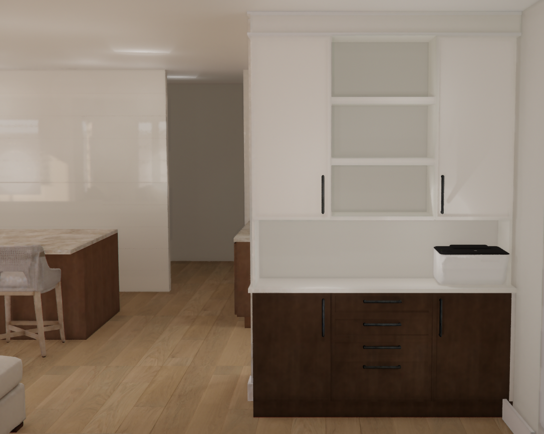 make photo realistic with soft natural lighting keep the wood cabinets more taupe toned oak wood keep the countertop white add accessories to the open shelves add a decorative mail divider to the countertop keep the floor taupe toned wood