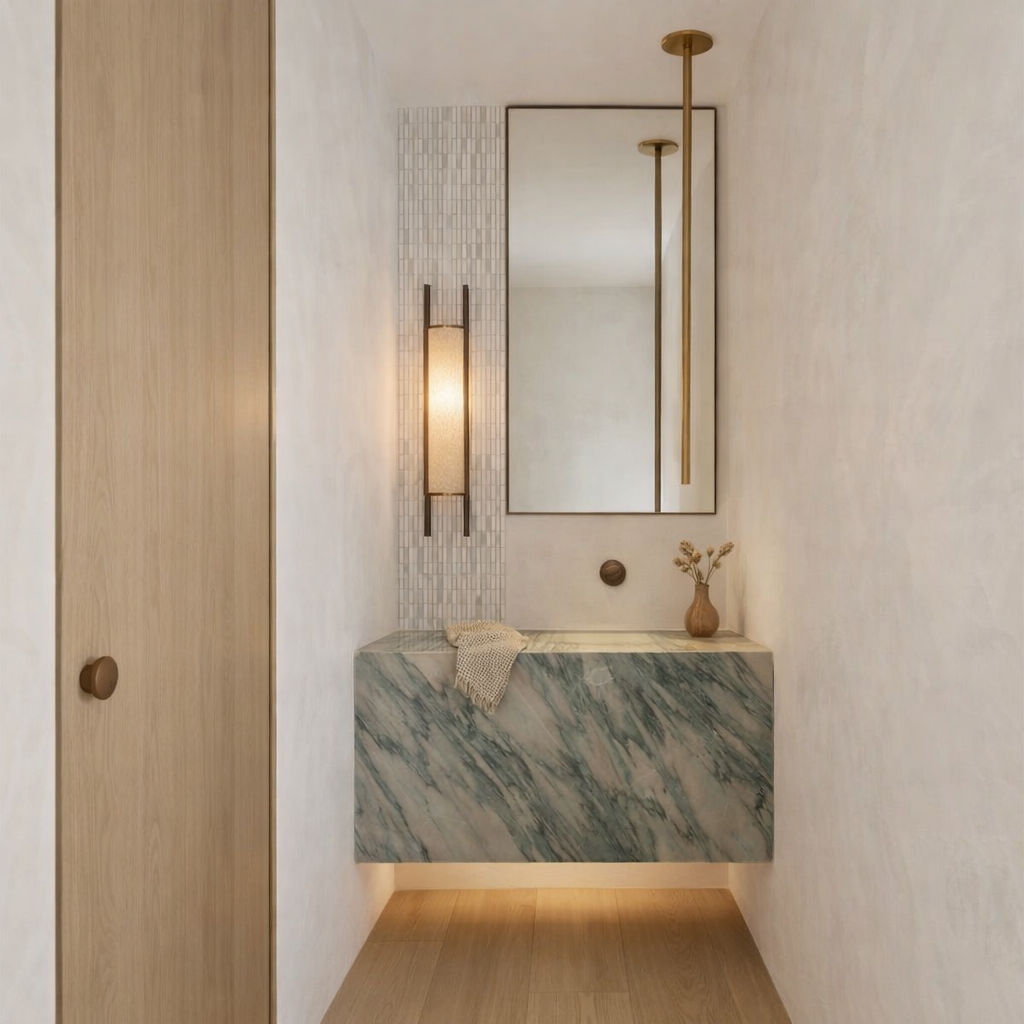 overall aesthetic warm contemporary minimalism everything is texture and proportion cabinetry flat front handle less doors throughout dark grey little bit brown wood grain stone countertop dramatic bookmatched or large format slab grey cream marble with heavy movement island has a waterfall edge with thick profile same stone used for backsplash on the stove wall sink side does not have stone backsplash flooring wide plank herringbone hardwood warm honey light oak tone matte finish medium width planks fixtures square angular matte bronze or gunmetal faucet minimal spout 90 geometry lighting sculptural pendant branching arm in dark bronze black with opal globe shades in varying sizes artistic not symmetrical subtle under cabinet or recessed puck lighting on perimeter wall warm glow on backsplash color palette for rendering cabinetry warm greige ncs s 5010 y50r or benjamin moore rockport gray range stone grey green marble with cream and charcoal veining floor warm light oak metal dark bronze antique brass matte furniture add modern sleek stools at the island