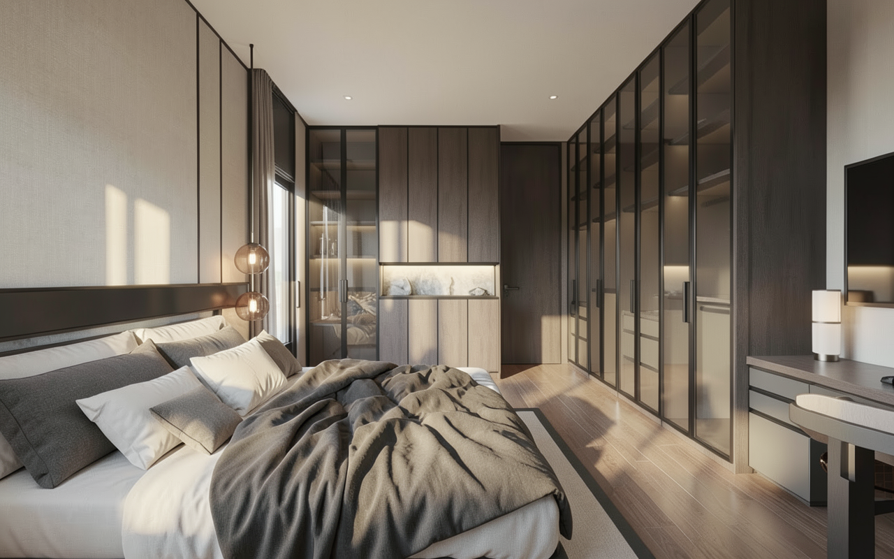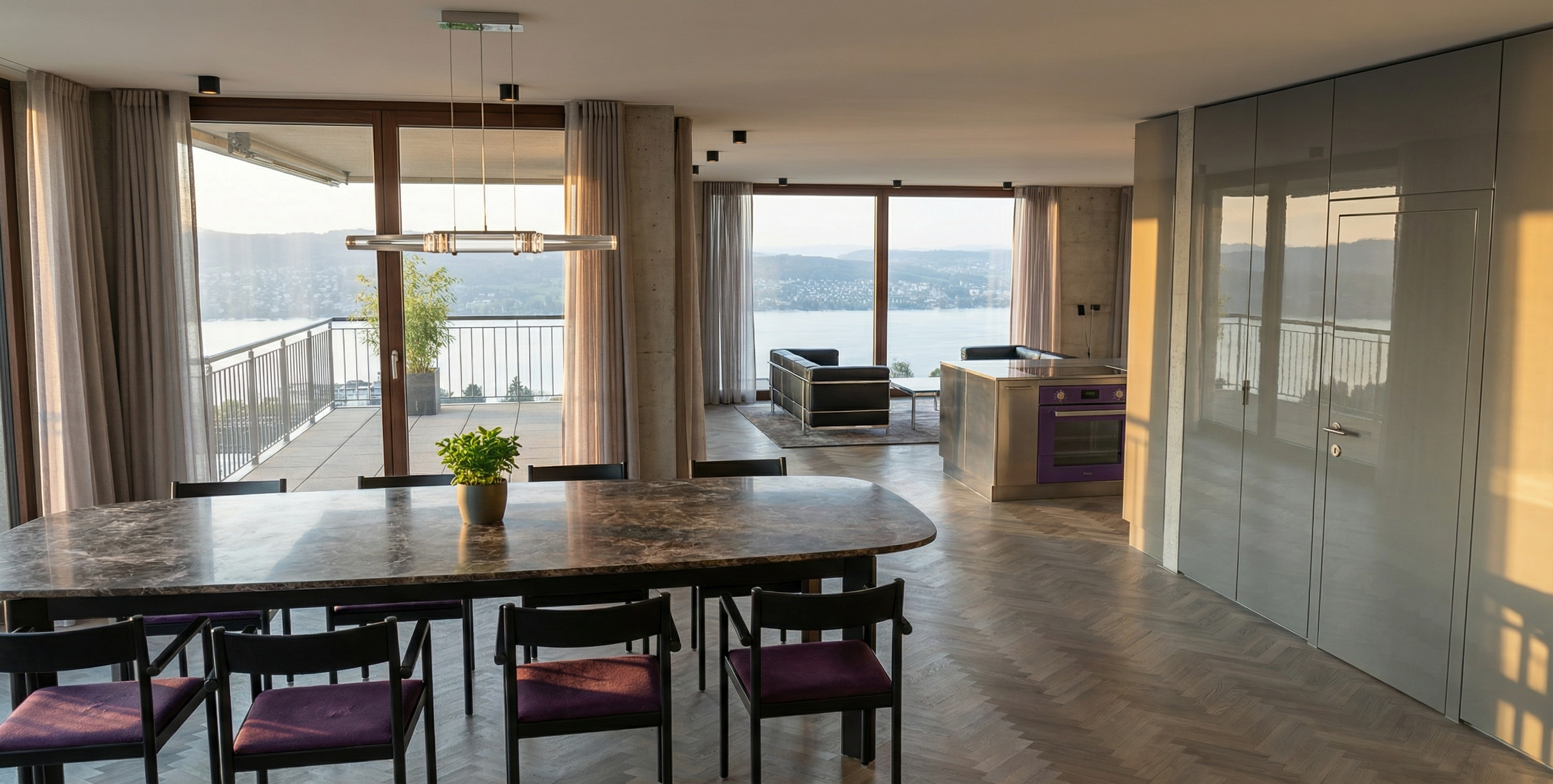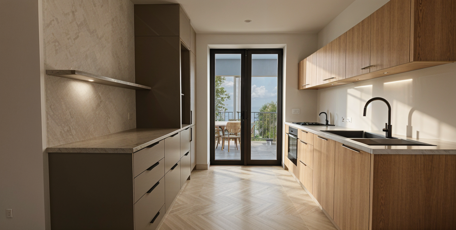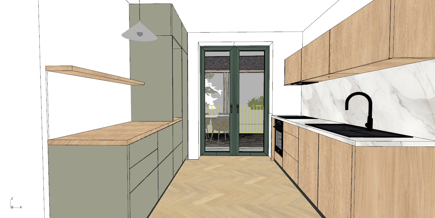 render a modern minimalist kitchen featuring light oak wood cabinetry with sleek black handles the left wall has a set of olive green cabinets and shelving with an overhead muted grey pendant light the right side includes a white marble backsplash with delicate grey veining the floor is a warm herringbone pattern in pale oak outside through glass doors framed in dark green is a balcony with hints of foliage and a soft grey evening sky creating a calm and inviting atmosphere
