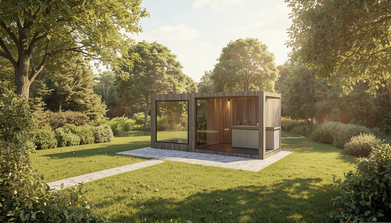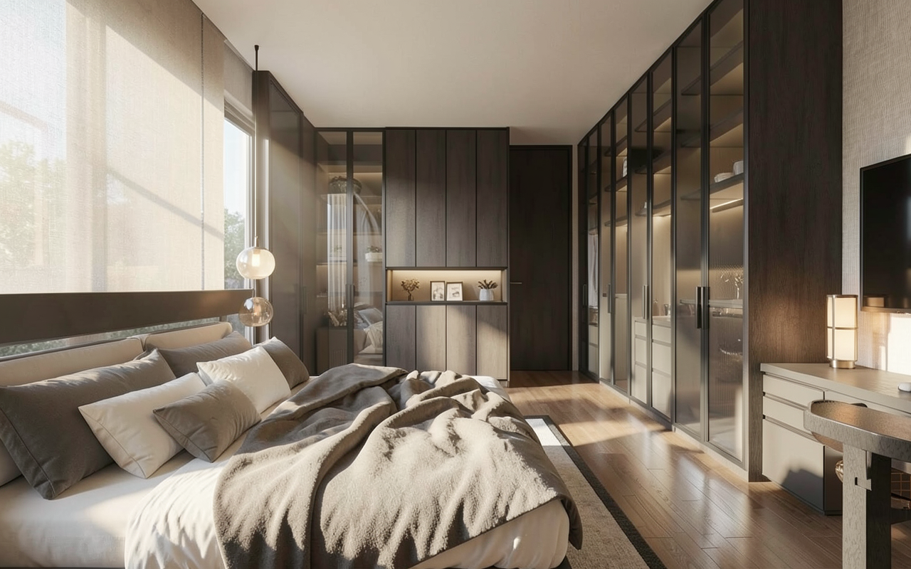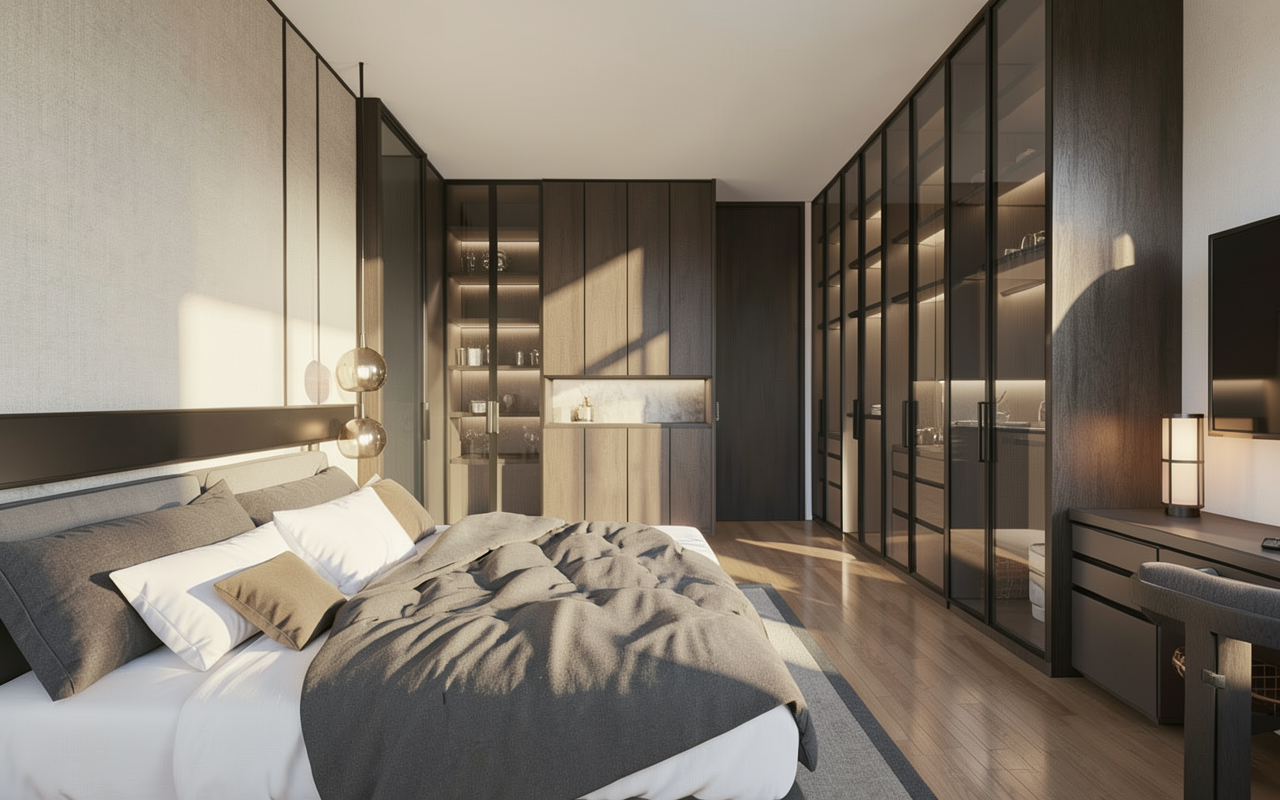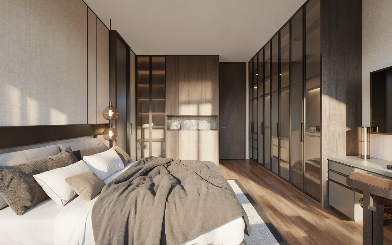 render a modern minimalist kitchen featuring light oak wood cabinetry with sleek black handles the left wall has a set of olive green cabinets and shelving with an overhead muted grey pendant light the right side includes a white marble backsplash with delicate grey veining the floor is a warm herringbone pattern in pale oak outside through glass doors framed in dark green is a balcony with hints of foliage and a soft grey evening sky creating a calm and inviting atmosphere
