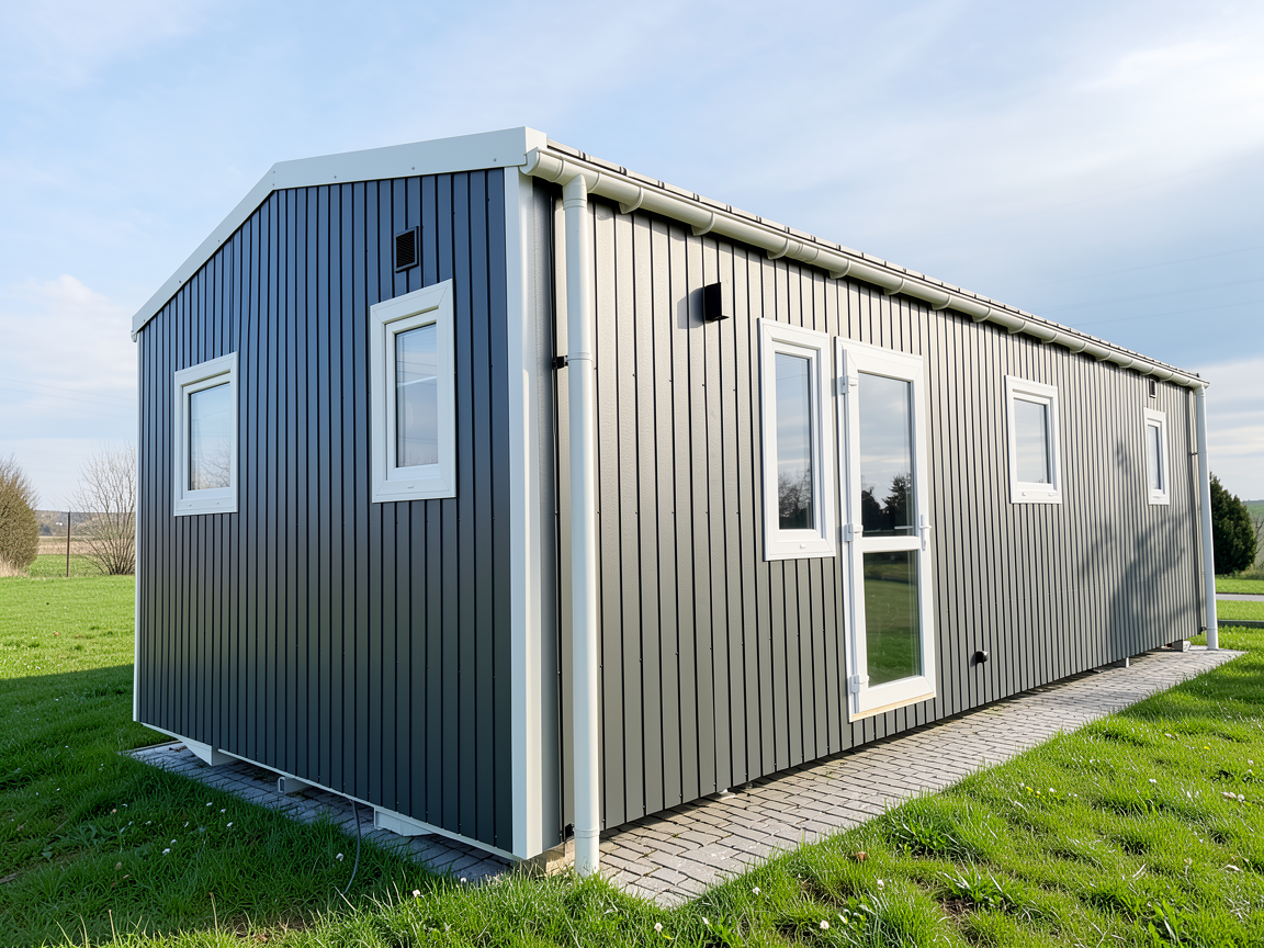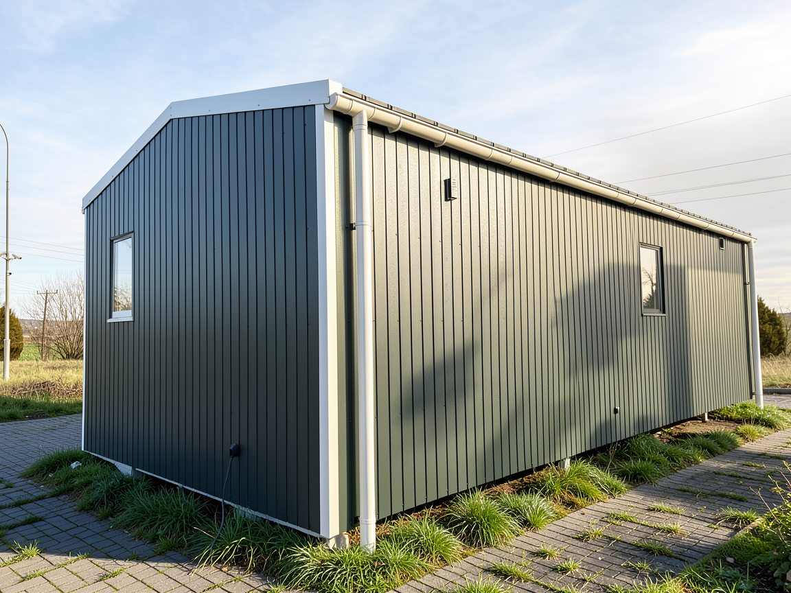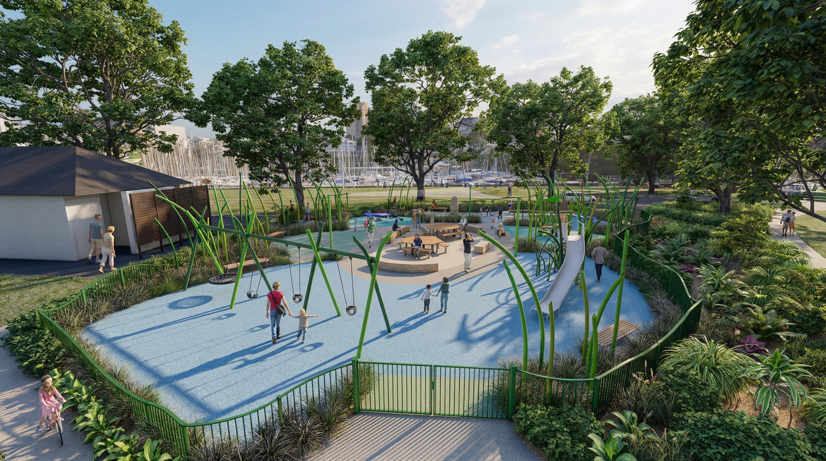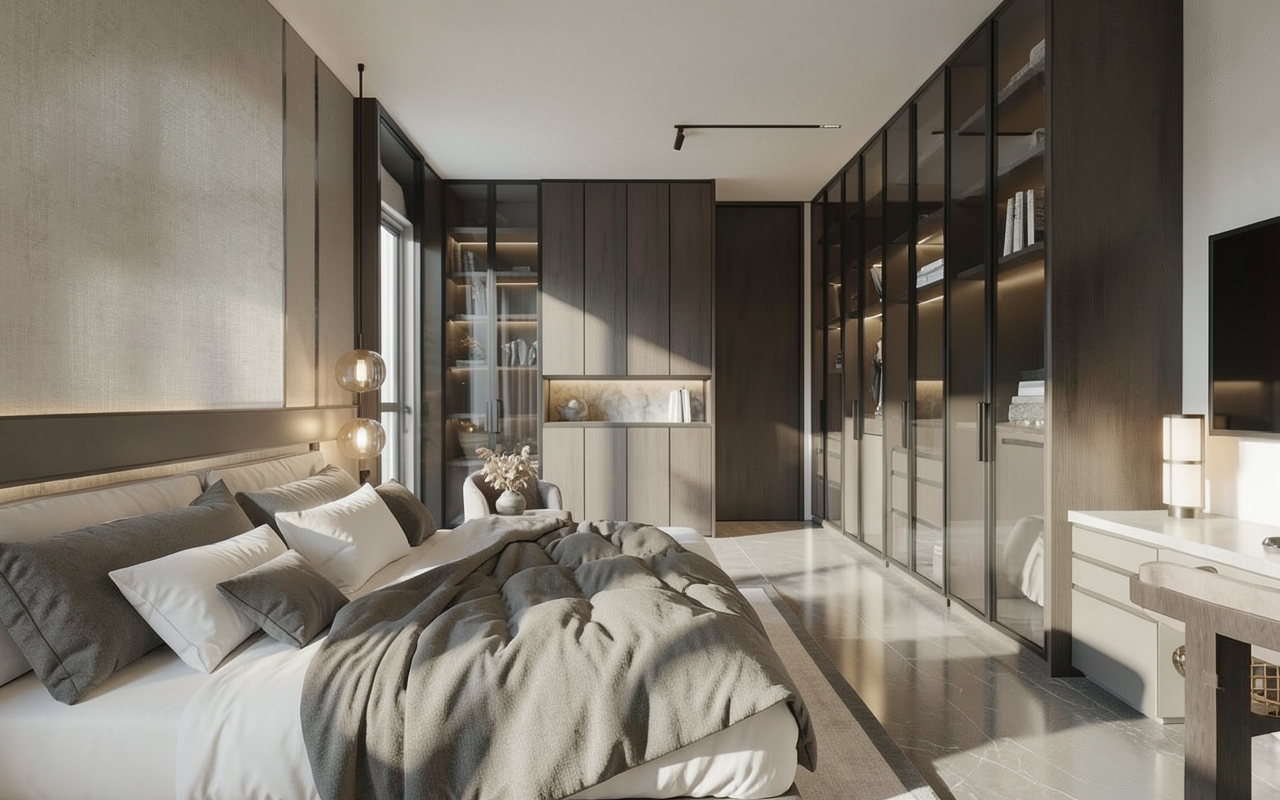 render a modern minimalist kitchen featuring light oak wood cabinetry with sleek black handles the left wall has a set of olive green cabinets and shelving with an overhead muted grey pendant light the right side includes a white marble backsplash with delicate grey veining the floor is a warm herringbone pattern in pale oak outside through glass doors framed in dark green is a balcony with hints of foliage and a soft grey evening sky creating a calm and inviting atmosphere