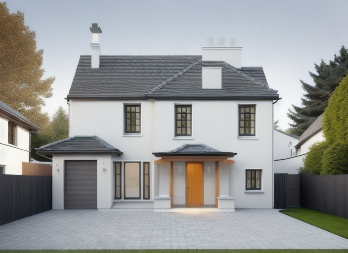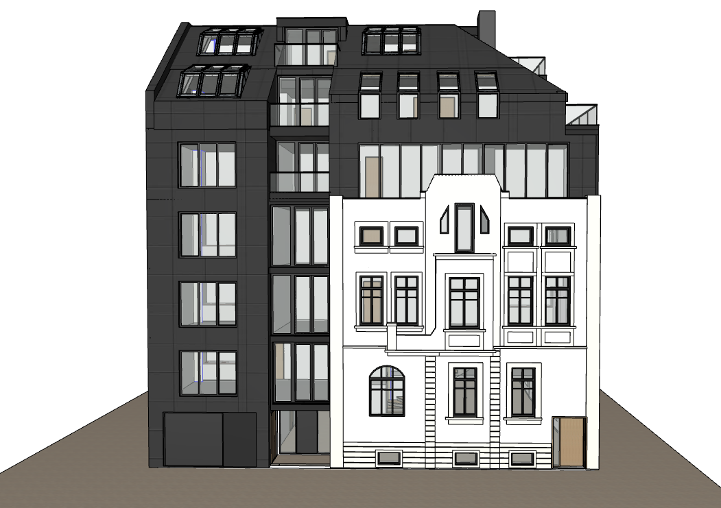 render a modern elegant building with a striking contrast between the black facade on the left and the pristine white old architecture facade on the right the left side features sleek dark grey window frames that complement the deep charcoal panels while the right side showcases classic architecture with ornate detailing in crisp white the atmosphere should be sophisticated and urban set under a clear blue sky with soft daylight to highlight the textures and architectural details add subtle reflections in the windows with hints of greenery visible in the background to enhance the scene s vibrancy