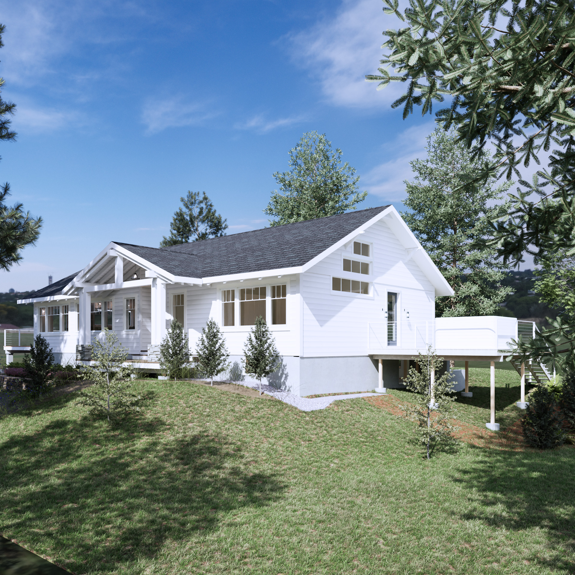 the house is surrounded by a lot of trees bushes and flowers in the garden
