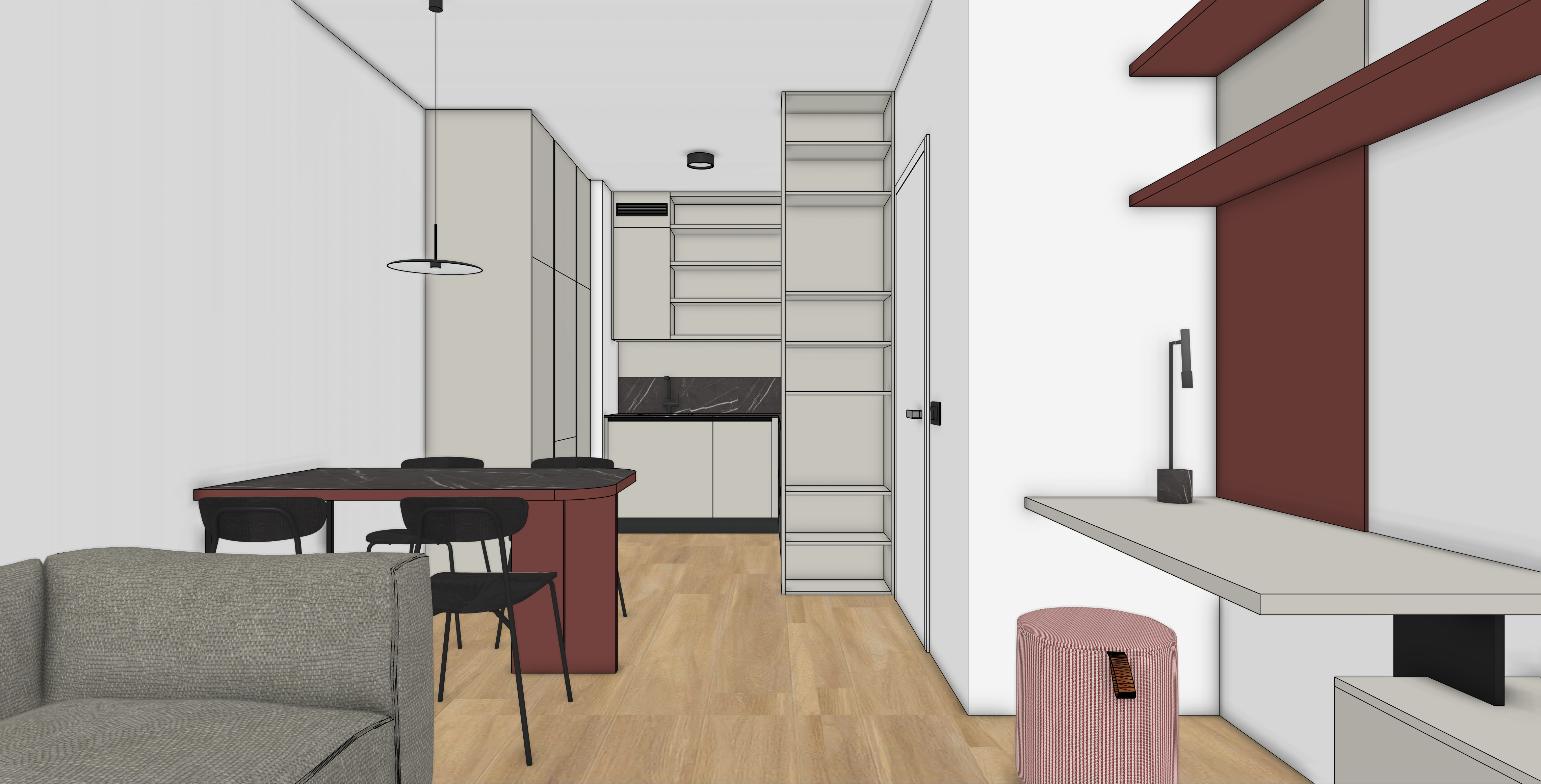 modern living room neutral palette with light oak wooden floor grey beige with pastel red accents on furniture matt finishes white walls soft shadows