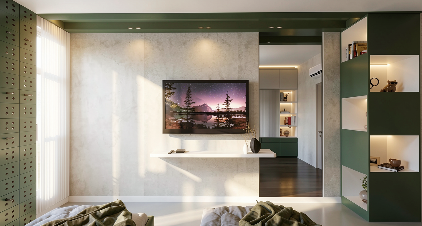 render the scene in high resolution with ultra realistic cinematic lighting preserve all objects colors textures and positions exactly use cool natural daylight entering from the left with soft volumetric shadows combined with subtle artificial lights to enhance depth and liveliness minimize unwanted glow on furniture at the top maintain the olive color slightly darker with cooler tone velvet texture on the bed headboard and subtle led lights in shelves emphasize simple horizontal wooden flooring parket without reflections do not change anything else ensure mirrors do not reflect the window focus on cool lifelike atmosphere with realistic lighting and subtle highlights