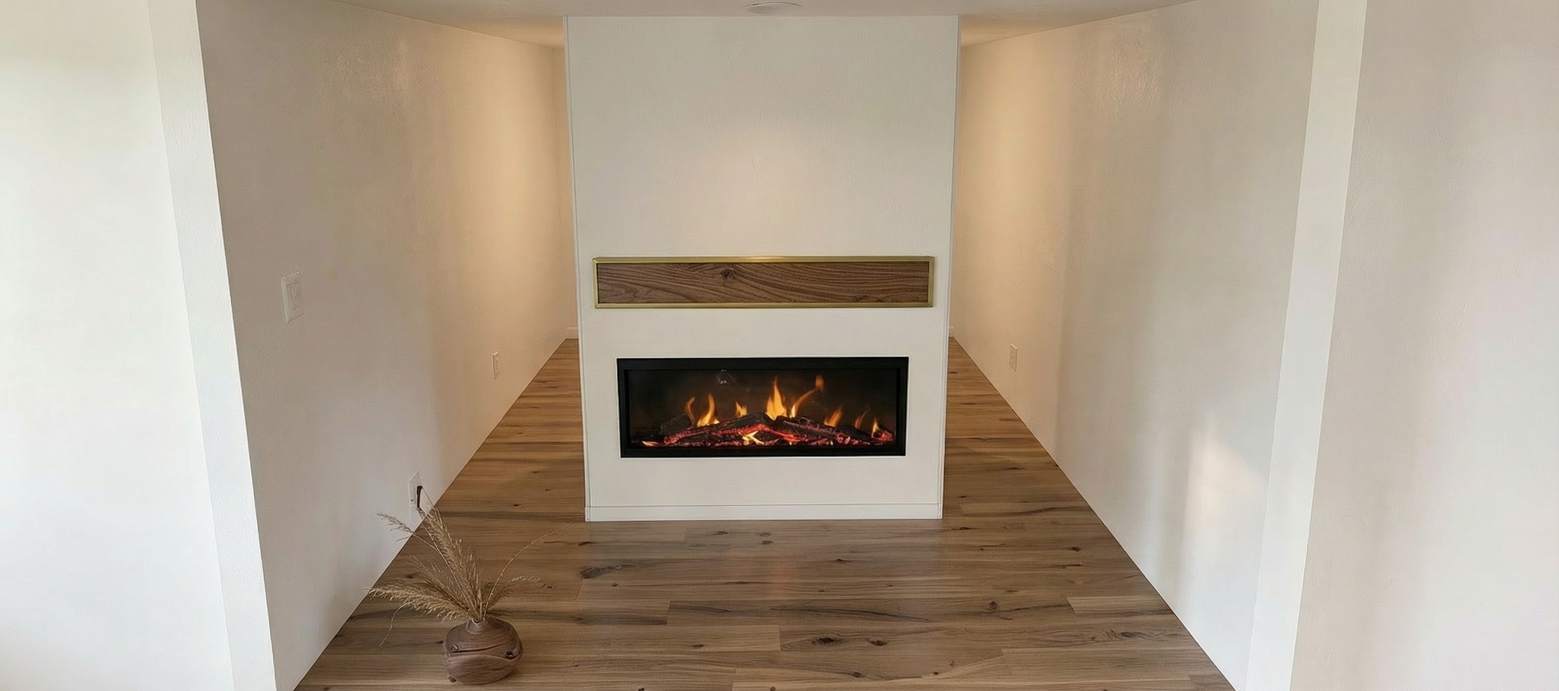 a modern minimalist room with a central electric fireplace set in a smooth cream colored wall the walls are a soft ivory providing a warm and inviting atmosphere the fireplace s flames flicker with vibrant shades of orange and yellow casting a cozy glow above the fireplace there is a decorative wooden accent in a light walnut color bordered with a subtle gold trim the floors are polished hardwood in a rich oak tone a small round vase made of ceramic clay with pampas grass sits on the floor adding a touch of nature and texture to the scene the lighting is gentle and warm enhancing the peaceful and serene atmosphere