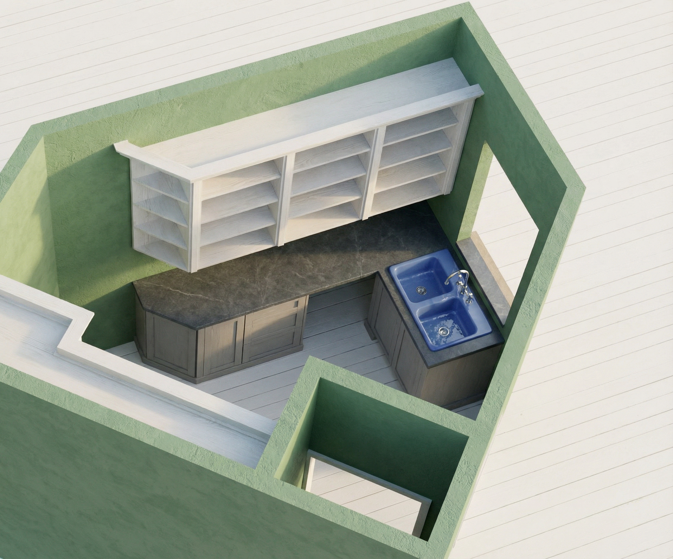 make a realistic image of this backyard using the moodboard materials and blueprint make the background lush and sunny and beautiful make the view from the back of the house use the exact floorplan and layout