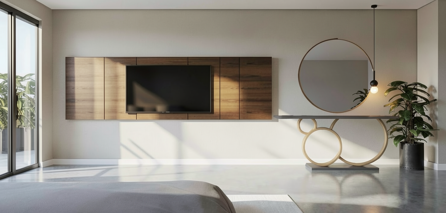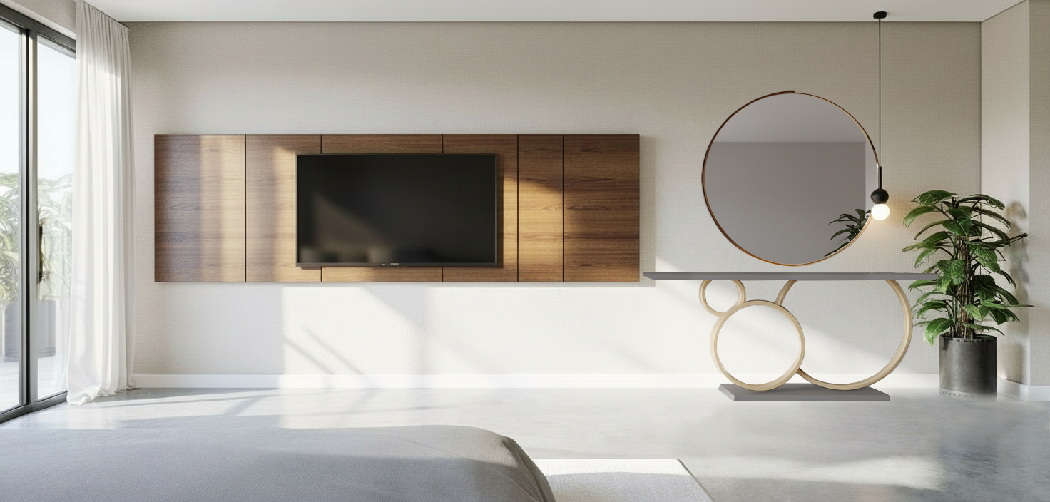 en la imagen las sombras de la habitacion se han quedado raras por la zona del suelo mejoralo sin cambiar nada elimina la cortina ponmealgun jarroncito encima de la consola