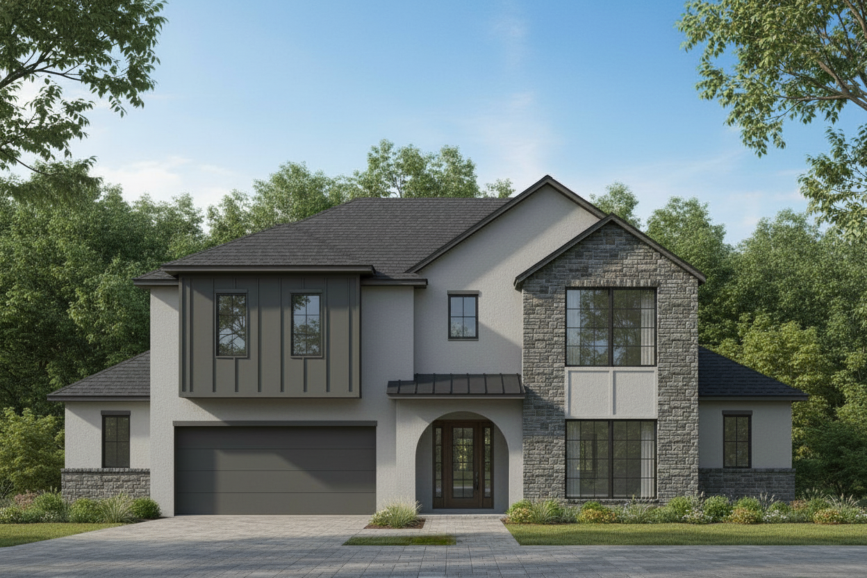sunset in the autumn season make building and surroundings photorealistic colors are different shades of grey black and dark brown angle parking spaces in front of the sidewalk grass with short landscaping in between the building and the sidewalk the building design should have a mixture of stone fiber cement and wood dark color pallet but welcoming